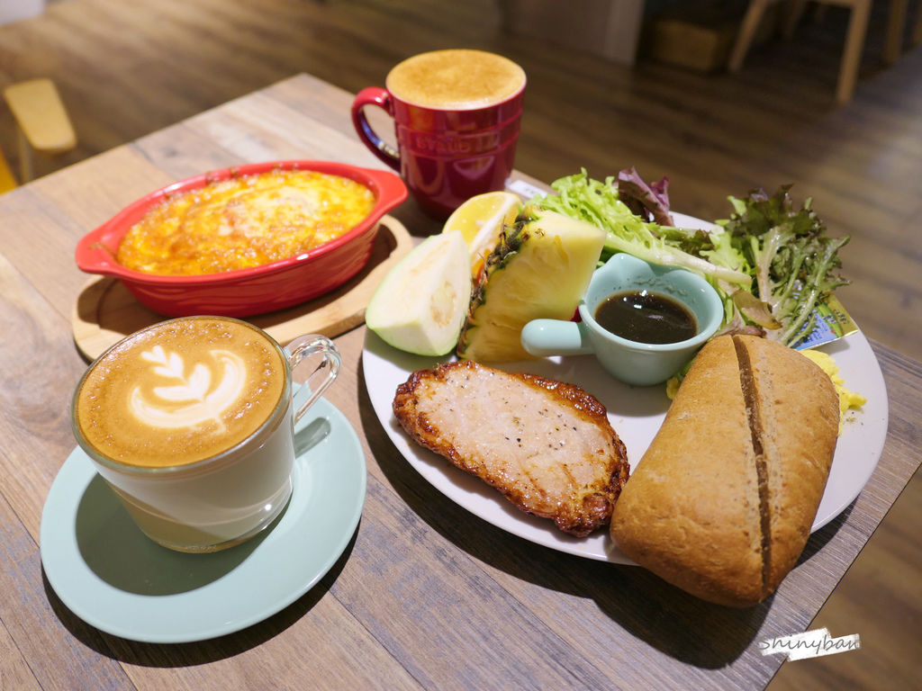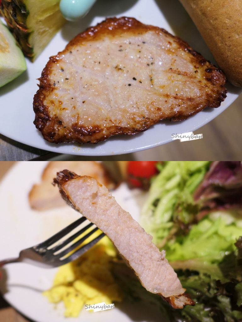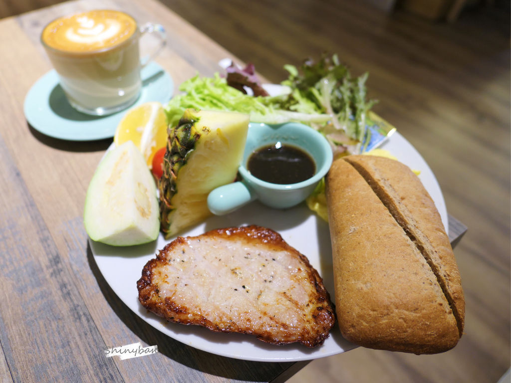 這道早午餐內含水果、生菜沙拉、優格豬排、炒蛋跟巧巴達,所有營養都一網打盡,分量以女生來說很剛好,男生可能稍嫌不足些。
