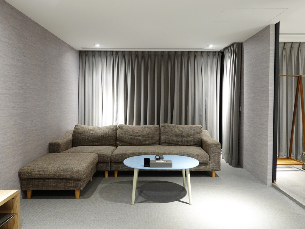 一進房間,映入眼簾的是一個超寬敞的客廳,深灰色的沙發配上米灰色的牆面及地面沉穩而有質感,和三五好友或是家人躺在沙發上看著電視吃著美食,愜意而幸福。
