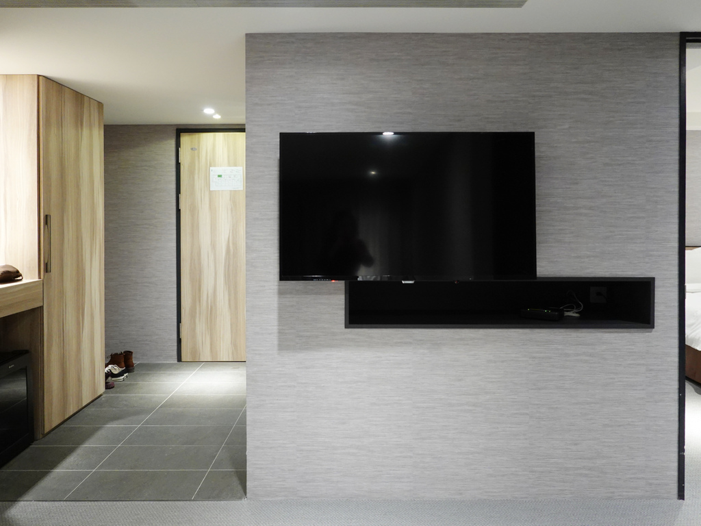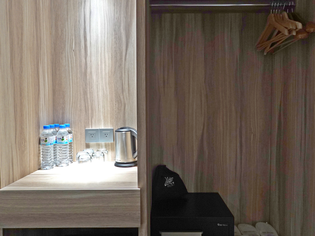 房間內該有的備品也沒有少,衣櫥中有拖鞋及保險箱,一旁的櫃子則有快煮壺及免費的瓶水,下方的靜音冰箱也可以作使用。順道一提,房間內的插座是國際萬用插座,對於外國的旅客十分友善。