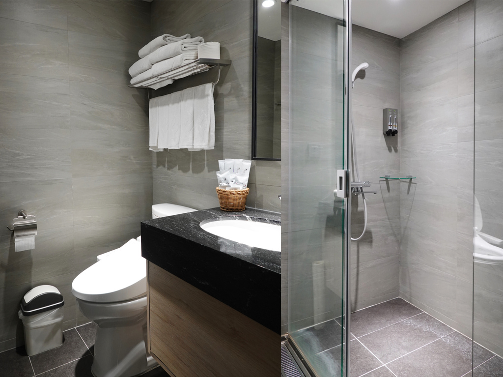 浴室部分承襲沉穩有質感的灰色調,也採乾溼分離,淋浴的排水槽是做在玻璃門下一排,所以水花完全不會噴濺到外面地板,這設計真的非常好!而旅店對於衛生更是十分重視,堅持客用毛巾不與擦拭毛巾混用,所以使用起來格外放心。