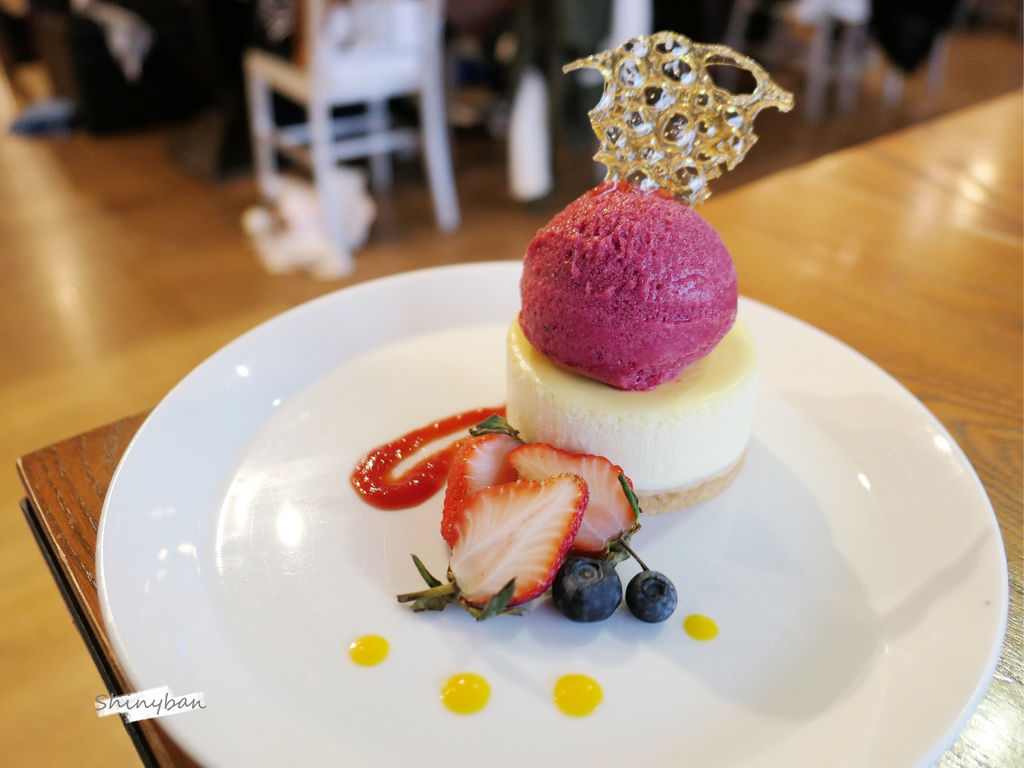這裡的起士蛋糕份量有點驚人,大概有一個手掌心大,加上一大球的莓果冰淇淋,兩個人分食綽綽有餘。起司蛋糕濃郁,甜度稍高,搭配上酸甜的冰淇淋剛剛好,很適合當大餐的完美結尾,或是和姊妹來喝下午茶的打卡美食,都是很不錯的選擇。