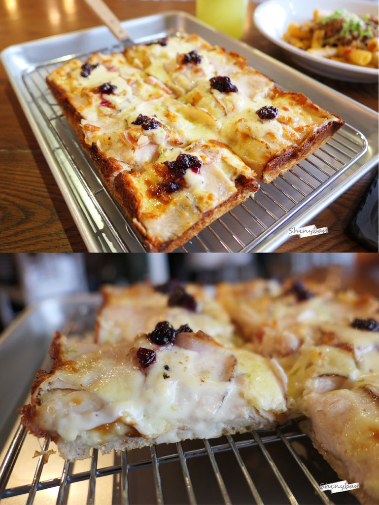 二次發酵麵糰加上先烤再淋醬,創造出內鬆軟有彈性、外脆口的多重口感,天天感恩節這口味更有別以往披薩的紅醬,是火雞肉、培根、起司和乳酪白醬的組合,上頭酸甜蔓越莓更是有畫龍點睛的效果,口感、口味都十分有層次,個人覺得是到「吃吧」必點的獨特美食!