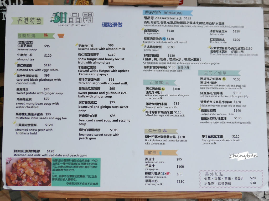 「甜品胃」的種類選擇超豐富,杏仁茶、燉奶、冰品、楊枝甘露都是遺珠之憾,如果吃膩了一般下午茶的蛋糕鬆餅,不妨可以來嘗鮮港式甜品。