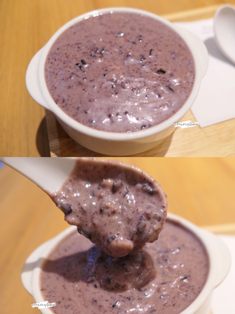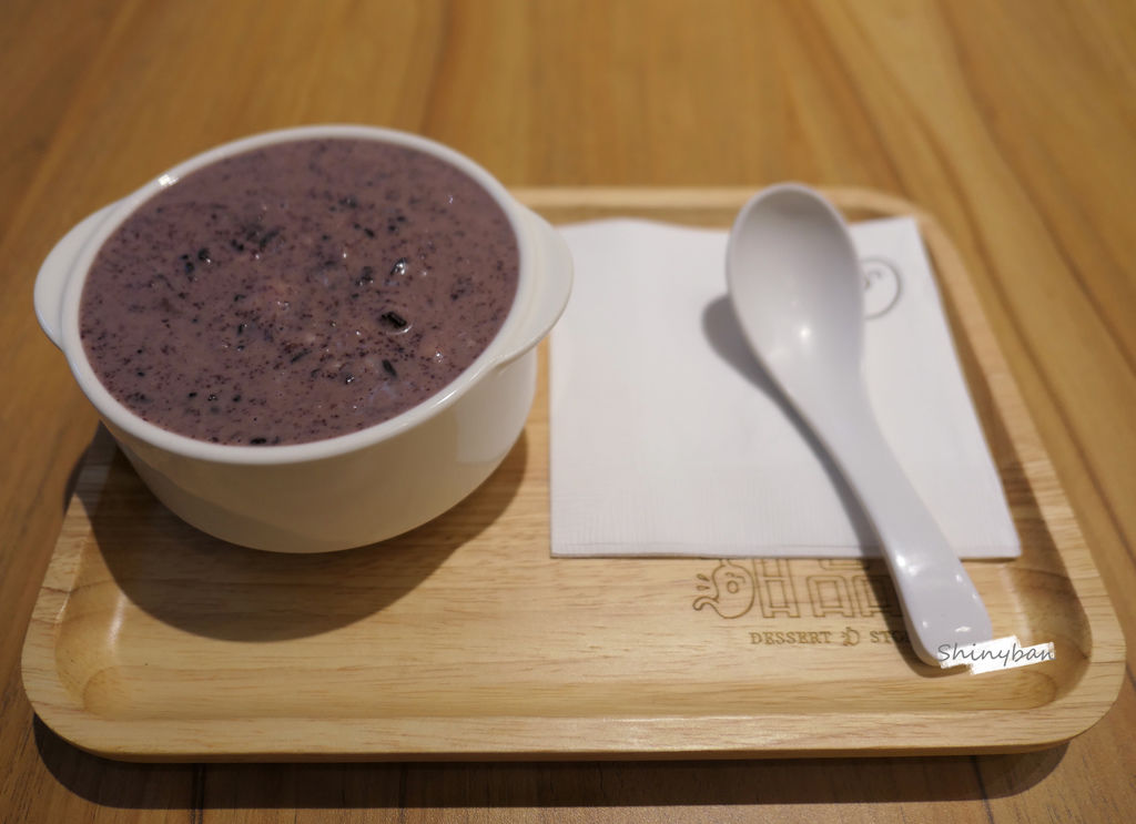 整碗紫米露盛裝得滿滿,分量並不少,以木盤擺放為港式甜品增添了些文青感。