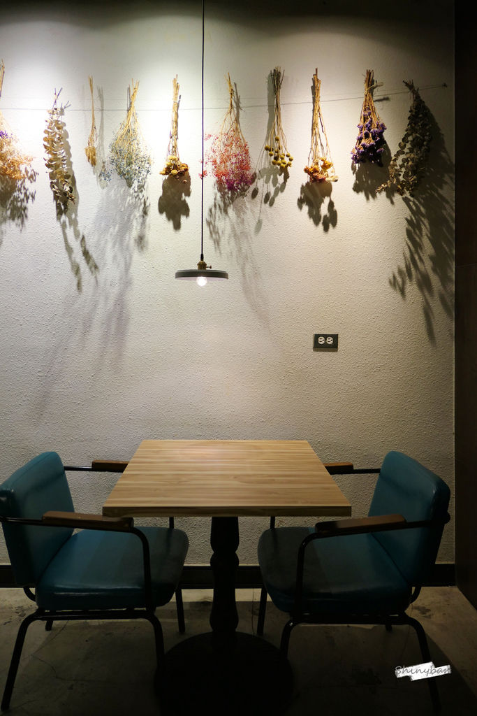 店內空間有著義大利小酒吧的氛圍,水泥地和深色的家具擺設,帶點神祕感,而牆面的乾燥花和垂掛的吊燈,則有加分的作用。
