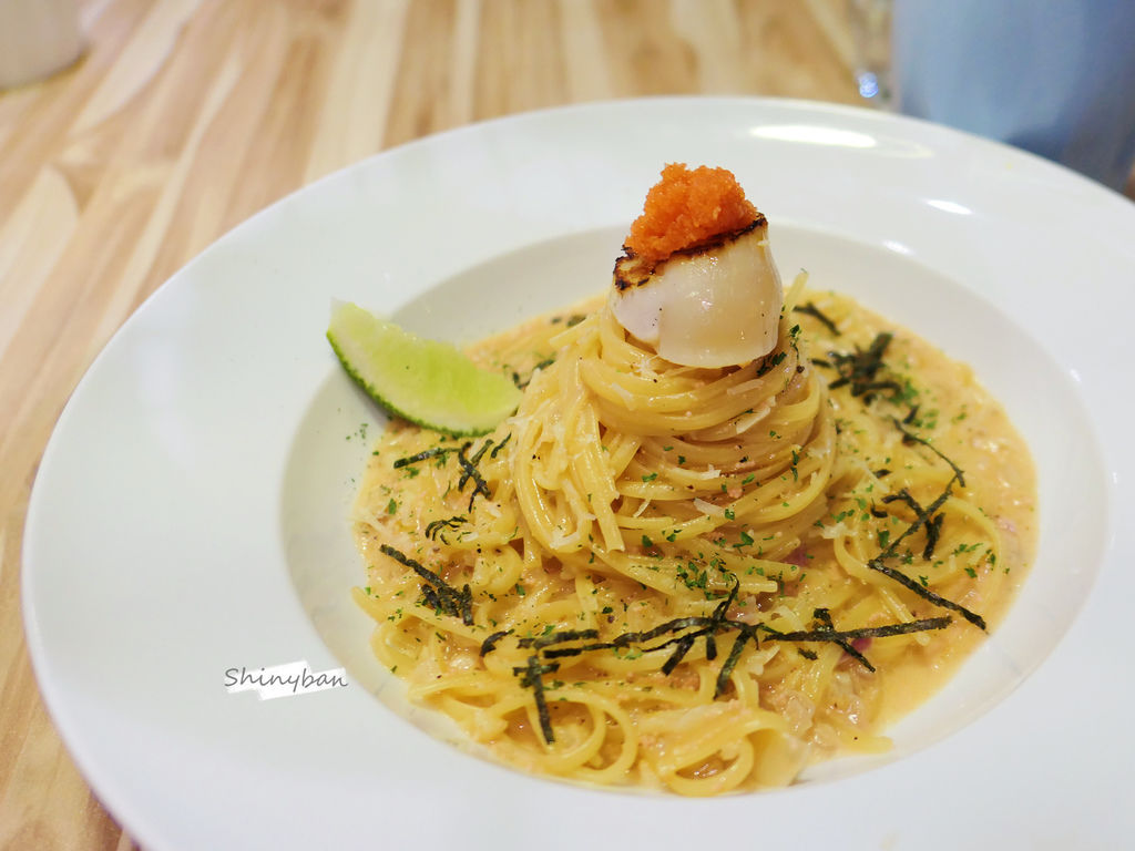 奶油跟明太子的組合,對我來說就像義大利麵屆的豆漿油條一樣,濃郁的奶油醬汁配上鮮香的明太子,還有那邊咀嚼邊啵啵啵的口感,真是令我愛不釋手。鮮干貝吃起來鮮嫩,擠上些許檸檬汁能更添清爽。
