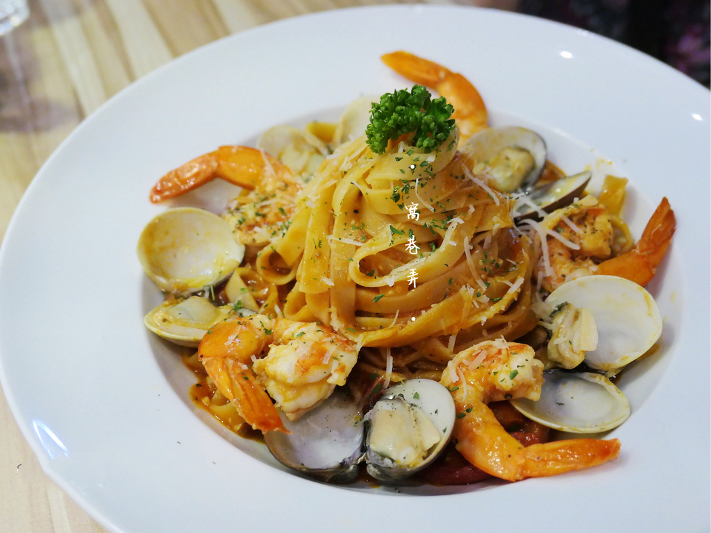 海鮮給的不少,除了鮮蝦外還有蛤蜊。鳥巢麵是因為他捲起的形狀而得其名,是屬於較寬的義大利麵類型,和番茄醬汁或是清淡口味最為合拍,是屬於爽口型滿合我胃口。