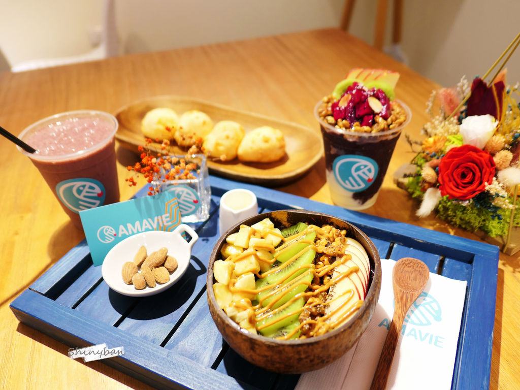 最底層是優格,上層是巴西莓果昔,最後再撒上核桃等堅果,以及繽紛的水果切片及火龍果丁,比起一般手搖杯,更來得健康及有飽足感,作為炎夏的下午茶是再適合不過。