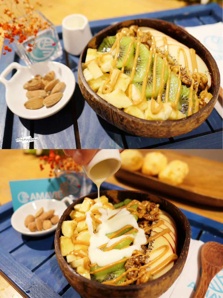 比利倍力是以香蕉、奇異果、蘋果、堅果鋪在巴西莓果昔上頭,最後淋上店家自製花生醬,一匙勺起,沁涼滑順的果昔配上各種口感及口味的水果,真的超幸福!