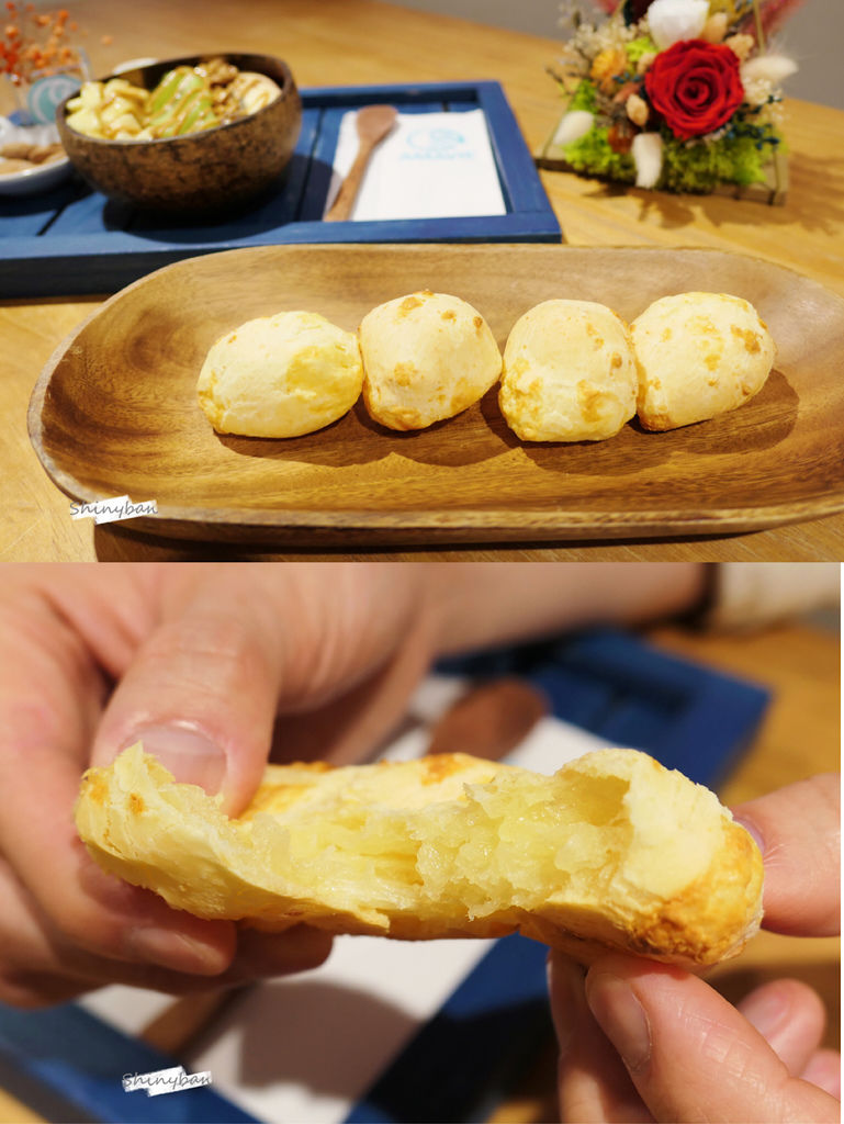 一上桌香味撲鼻,外層酥脆,內層帶有Q度的咬勁有點類似麻糬,口感讓人上癮又兼具飽足感,加上帶有點微微起司鹹味,搭配上莓果杯或是飲品真的超滿足!