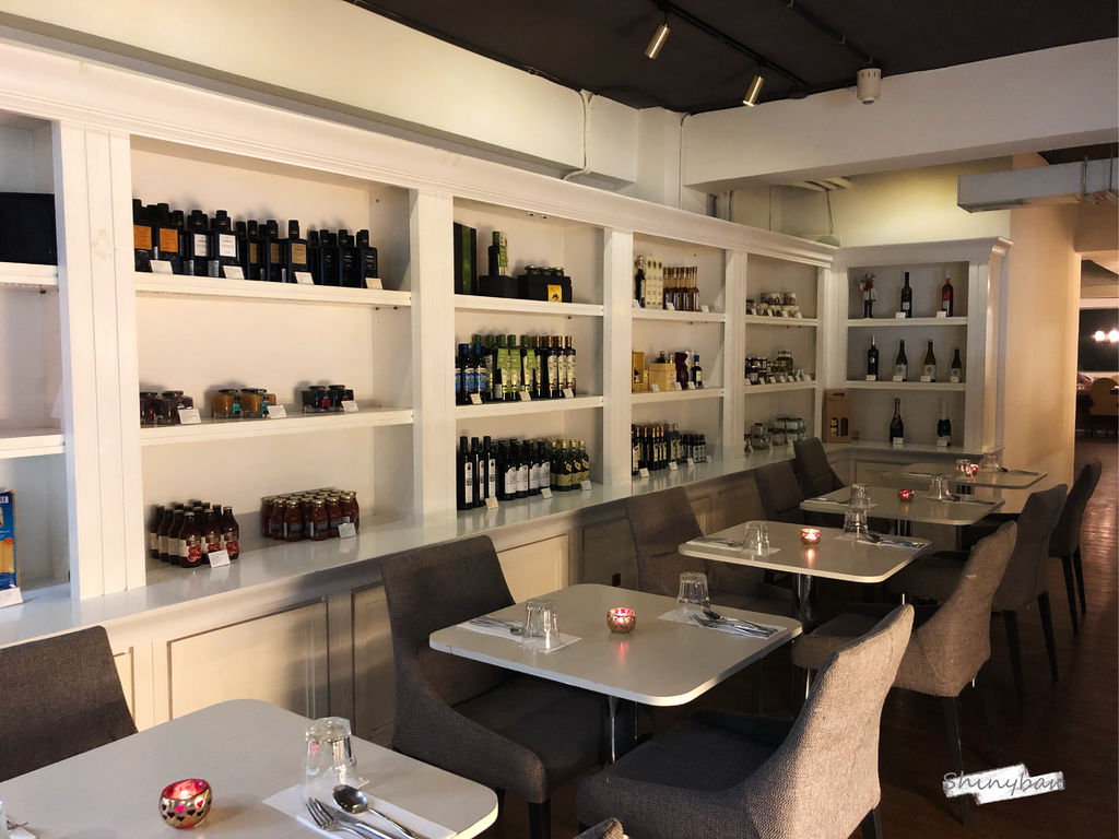 「Bianco Taipei 義式餐廳」的集團是義大利食品進口代理商,所以店內使用的食材及調味料,舉凡橄欖油、黑酒醋、義大利麵等等,皆是從歐洲進口而來,若是客人吃得喜歡,也可以用新台幣帶走這些陳列的商品。