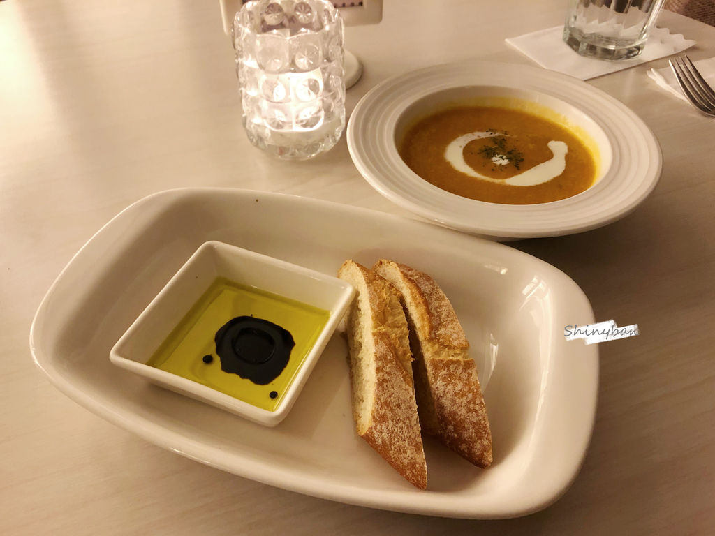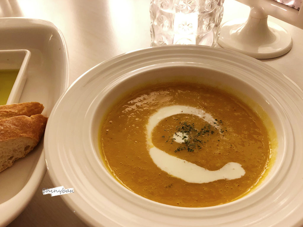 當天的套餐湯品是南瓜濃湯,雖說滑順濃郁,但仍能品嘗到南瓜的纖維感,感覺是真材實料,且帶有南瓜自然甜味,而非沖泡湯品,我很喜歡。