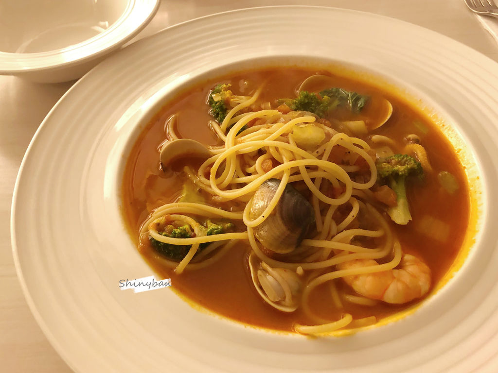 和一般收汁義大利麵不同,是呈現有點湯麵的感覺,讓我想到了 「SPIGA PASTA」。裏頭的海鮮有蛤蜊、蝦仁、魷魚、魚片等等,還有一些蔬菜,口味來說偏清淡,可以吃到食材本身的鮮味,但湯湯水水的不太習慣,我還是比較偏好海鮮湯跟義大利麵分開的口感,也比較不會影響到麵條的軟硬度。