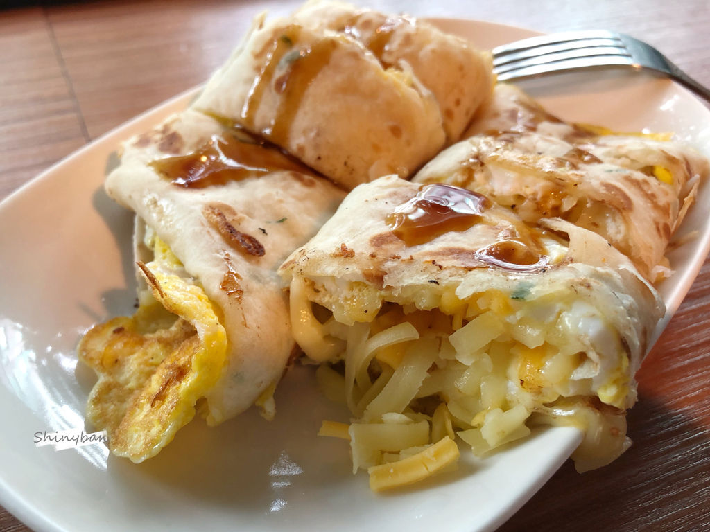 到了我最期待的蛋餅!之前爬文就得知他們家的餅皮是乾爽型的,完全是我的菜!(其實也很想點薯餅塔、瑪芬堡、丹麥吐司……只是無奈胃容量不夠)