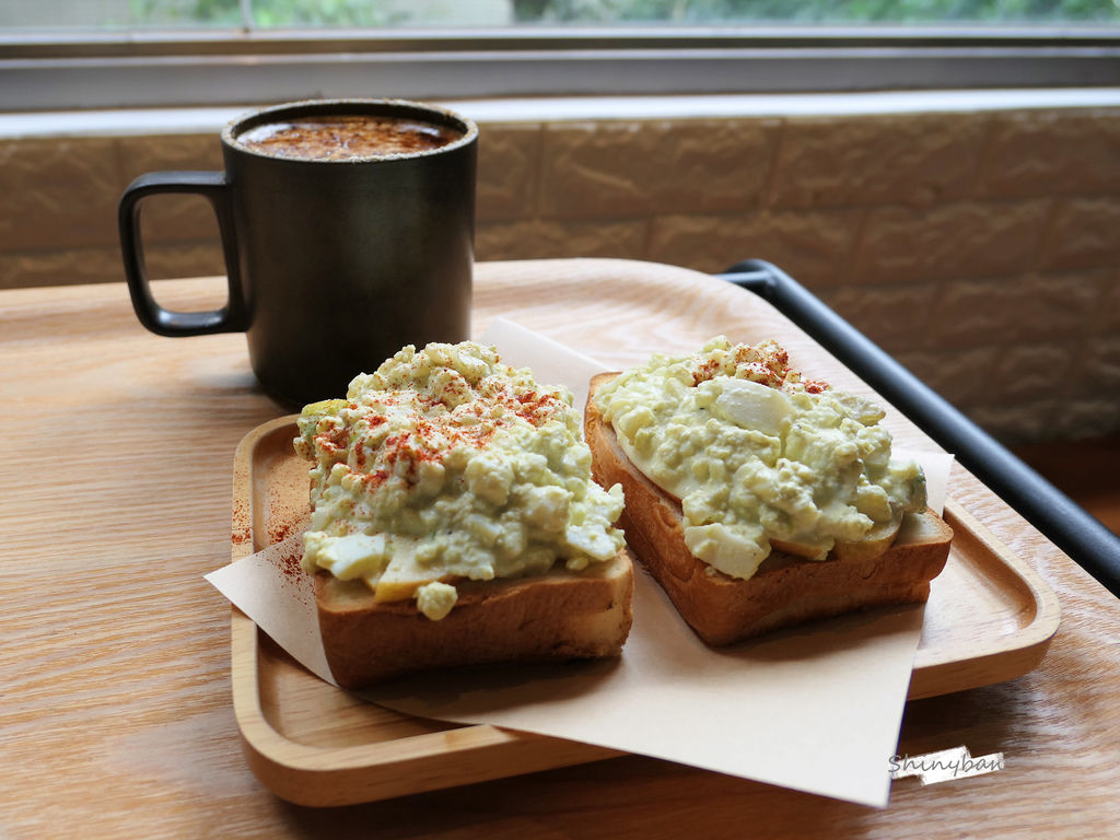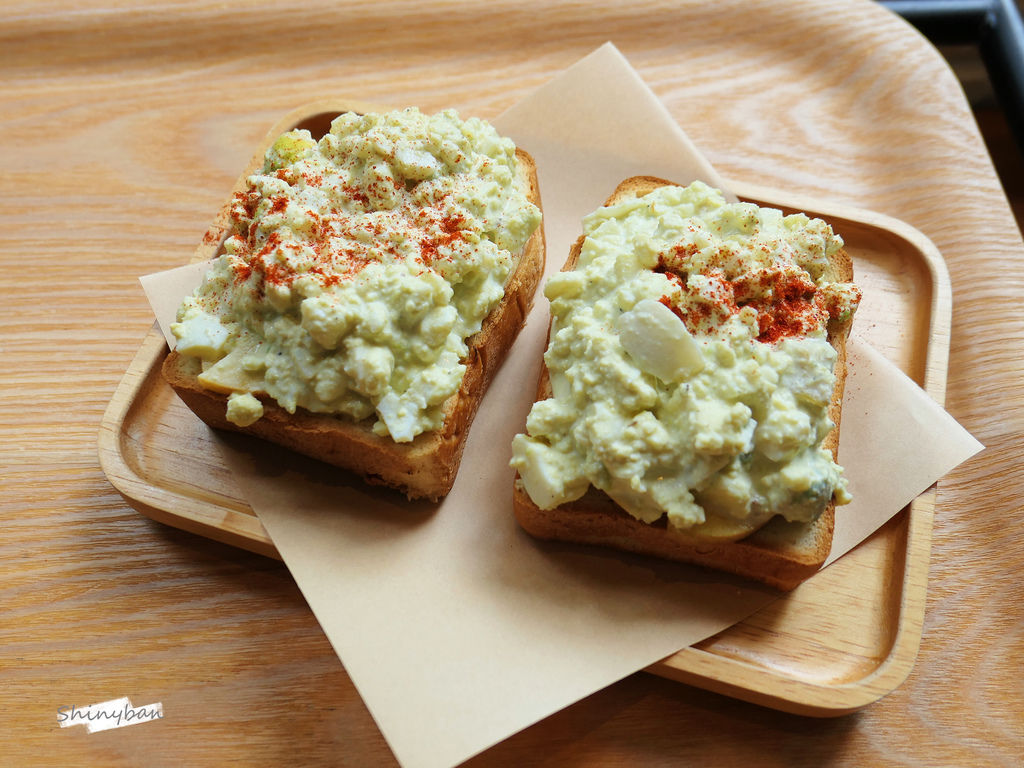 兩小片烤得酥脆的方形厚片吐司,上方以蘋果薄片為底,再加上和馬鈴薯、酪梨混合的蛋沙拉。我本身很愛吃酪梨,對我來說酪梨味道偏淡,是屬清爽無負擔型,整體吃完也是挺有飽足感的,配上一杯拿鐵,很適合當健康的早午餐。