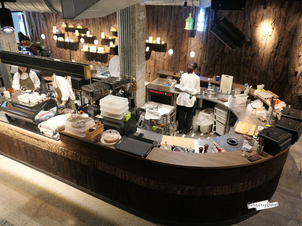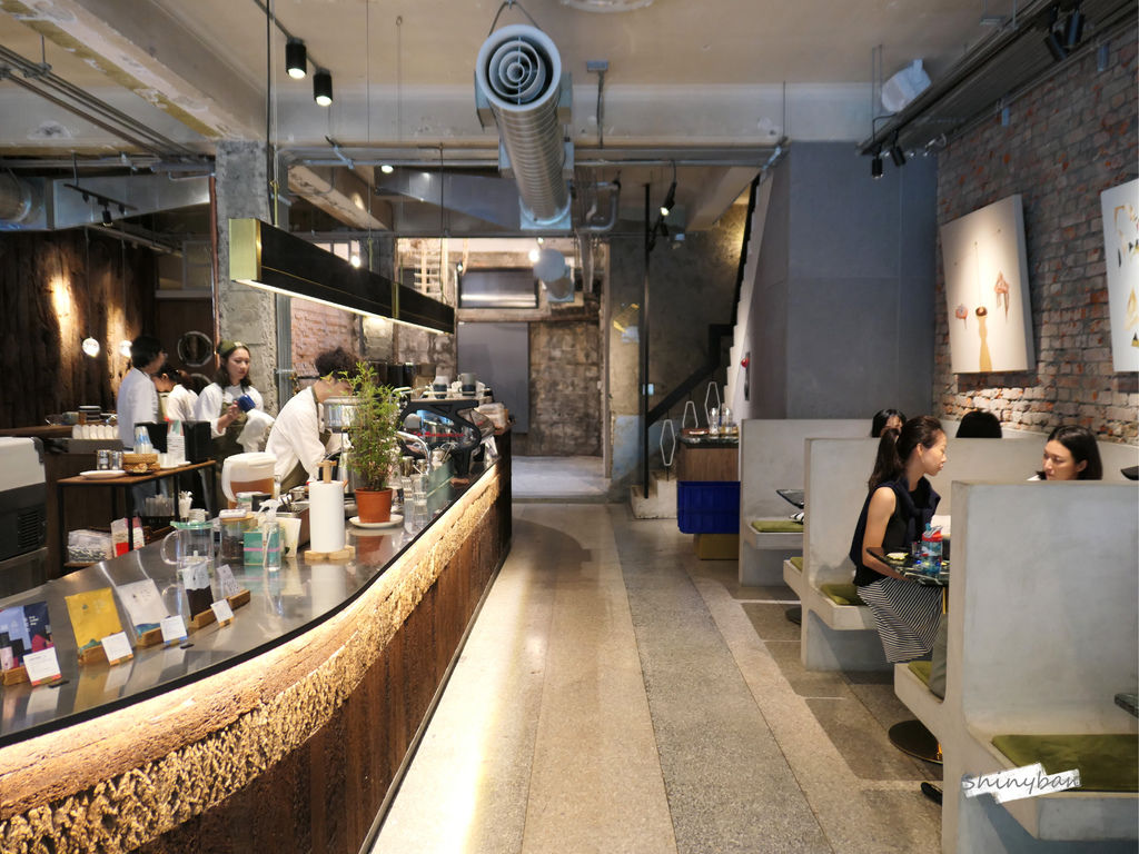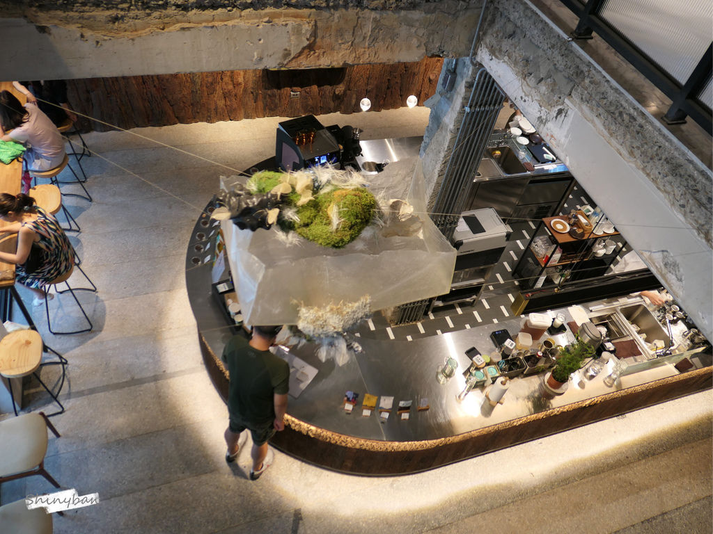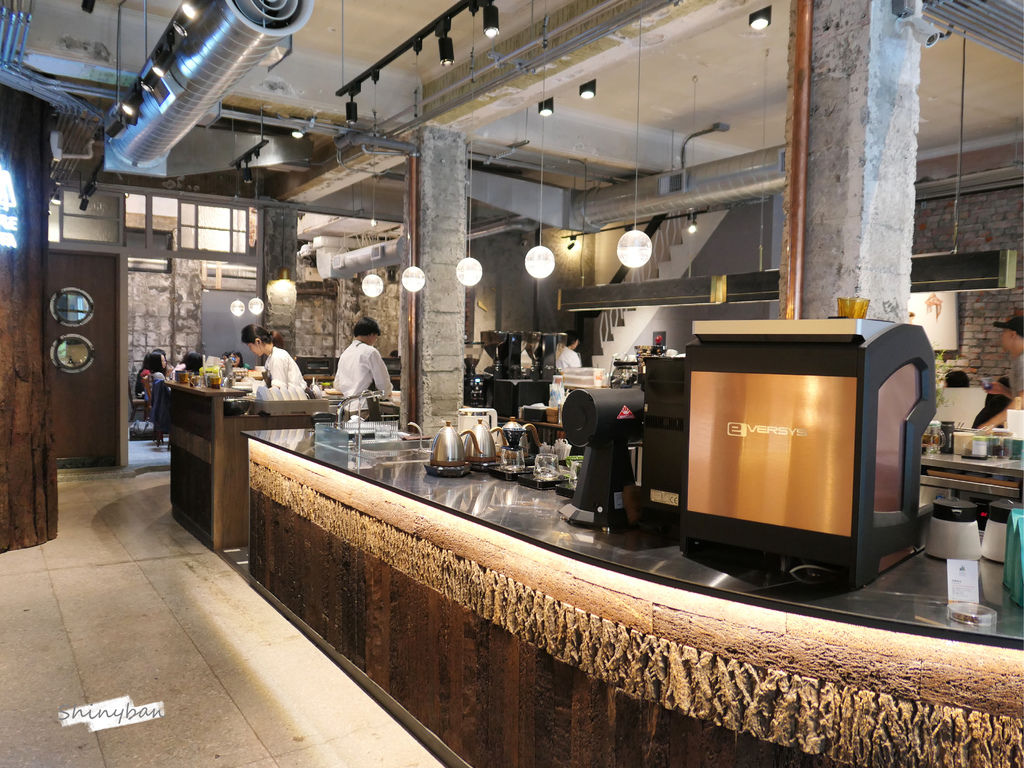「興波咖啡」是以咖啡森林作為設計概念,水泥、磨石子地、木材、磚瓦、大理石等各種素材融合成一充滿設計感的空間,貫穿二樓的天井設計更是營造了空間感,風格十分強烈。而佇立於中央的開放式環型吧檯更是深得我心,專業又大氣。