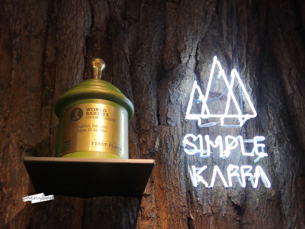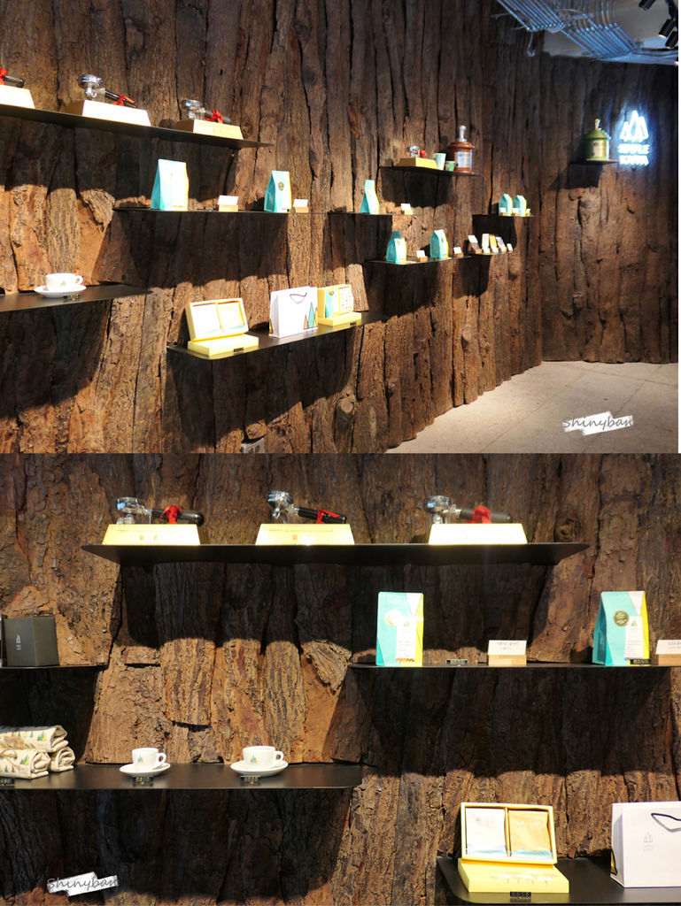 在吧檯的桌面上及一旁的牆面上,皆有擺放著店家的精選咖啡豆供客人挑選購買,其中也有得獎的冠軍豆,以及冠軍獎座。