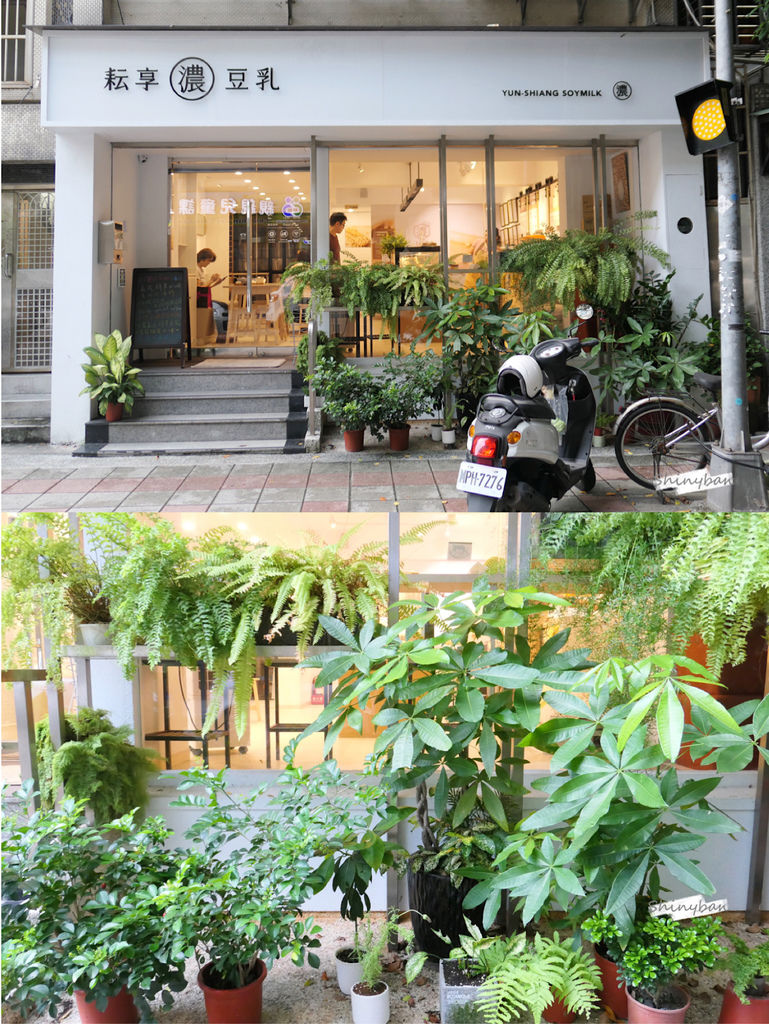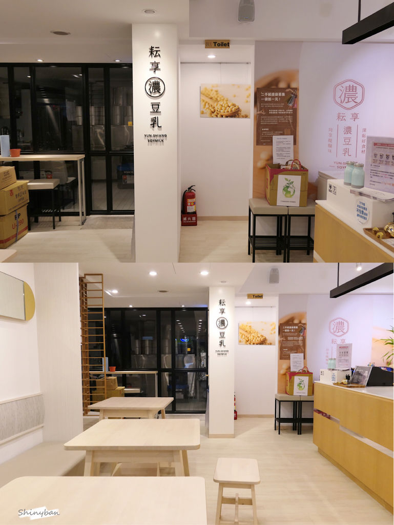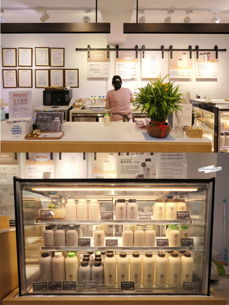 由於身處綠意盎然且靜謐的住宅區中,其外觀也是有著保護色的簡約,以白底黑字為主的乾淨門面,如同他們家販售的豆乳般純粹、純淨。