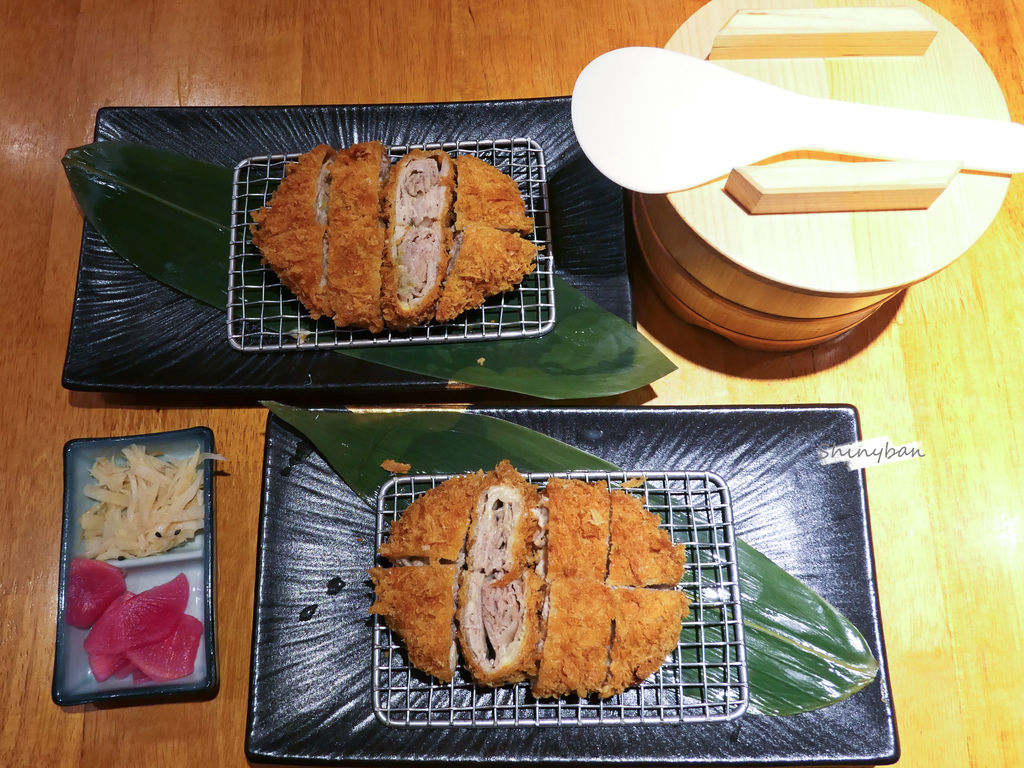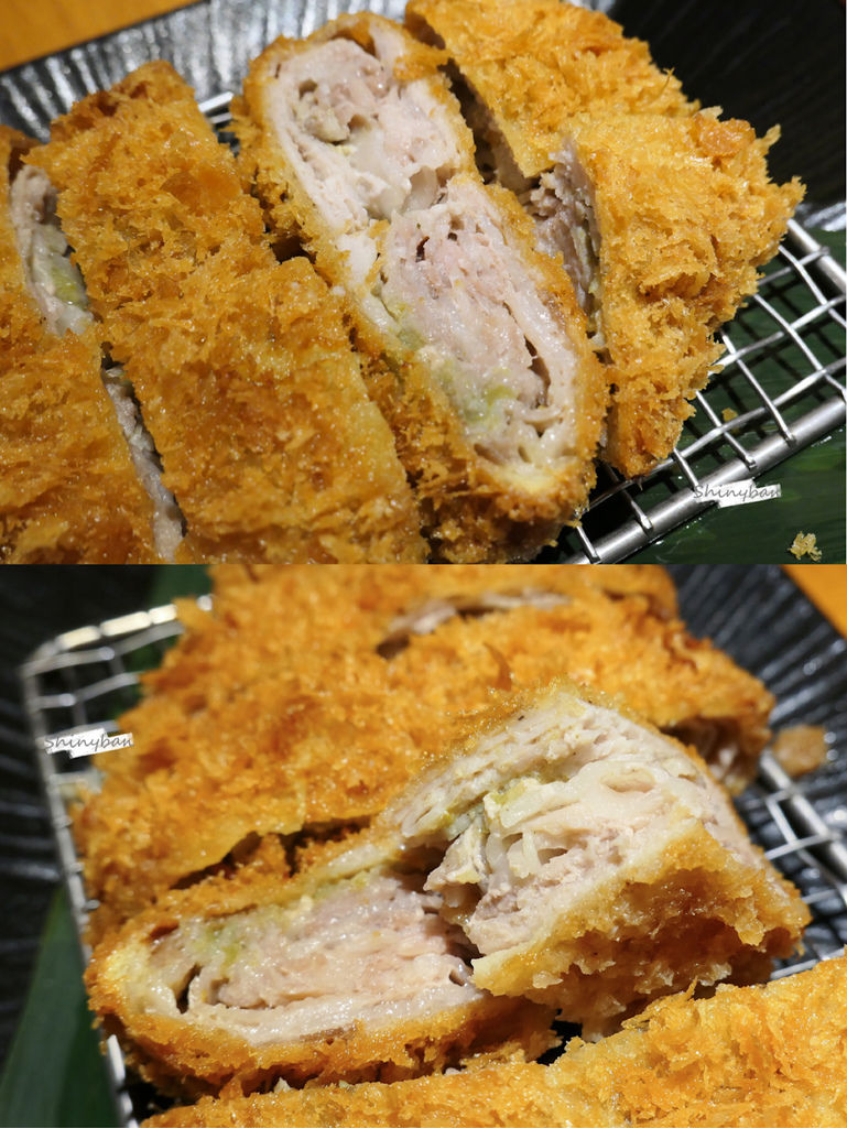 千層豬排是以三元豚肥瘦相間部分製成,中間包上各式餡料,可以看得出來油花比較多的,而且中間有些空隙,雖外層酥脆,但吃起來有點膩口跟不扎實。