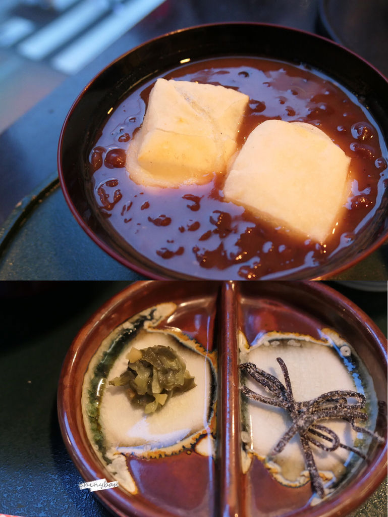 而說是一碗,不如說它是一個組合,除了善哉本體之外,還有昆布茶,以及鹽漬昆布、醬菜做為配料。
