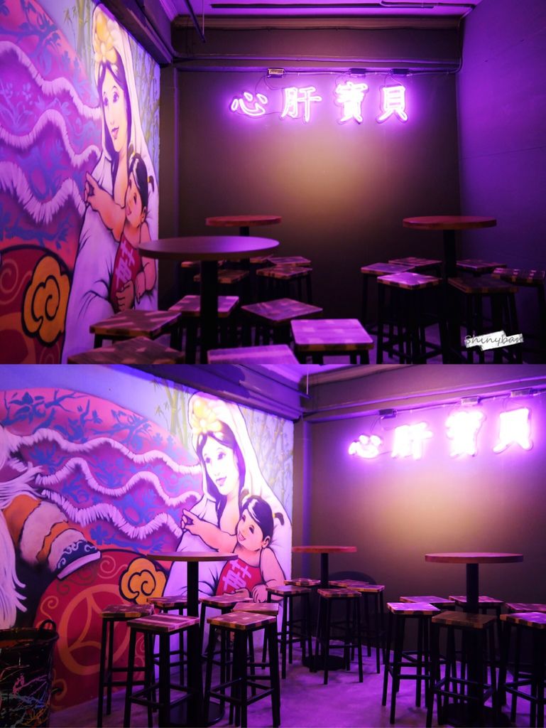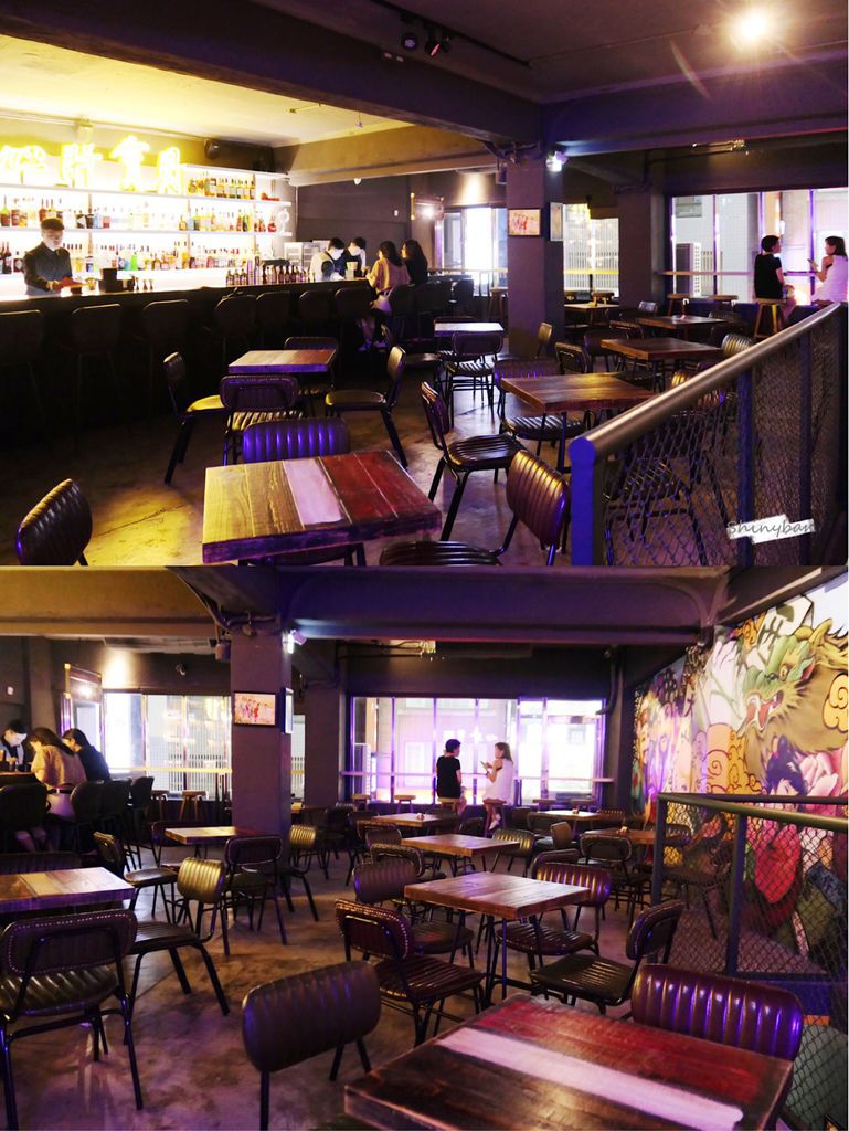 店內的氛圍非常獨特,怎麼會是用獨特來形容呢?是因為有太多種元素融合。牆面大片的復古塗鴉、霓虹的燈飾擺設、復古麻將桌面,整體散發出一種奇幻迷幻的氛圍,十分有趣且引人入勝。