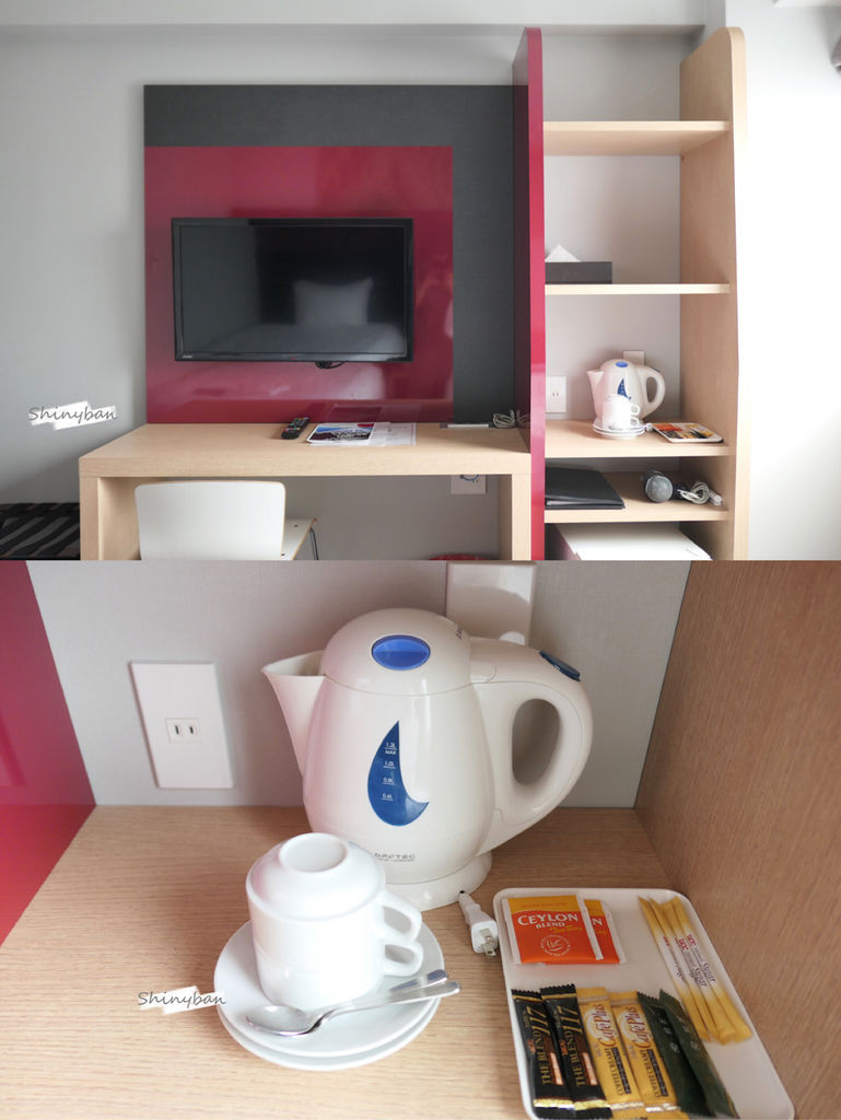 床前方則是電視、小冰箱以及化妝/辦公桌,泡麵必備的熱水壺也沒有少,雖說設備不多,但該有的都有。