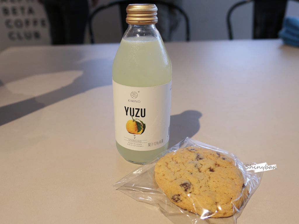 一般的瓶裝柚子碳酸水,就不多加贅述,餅乾也是價格驚人的一片上百,但口感就是偏硬的巧克力豆餅乾。