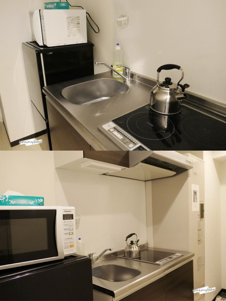 小廚房有著熱水壺、微波爐、冰箱等等設備,櫥櫃也有各式各樣的鍋碗瓢盆,如果想省錢不在外頭吃飯,超市買些材料回來料理也是頗溫馨的!