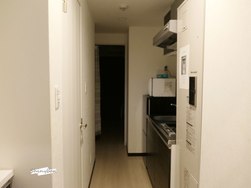 一進房門後是個小通道,右方是開放式小廚房,左方是分離式浴廁及洗衣空間,深處才是臥室。