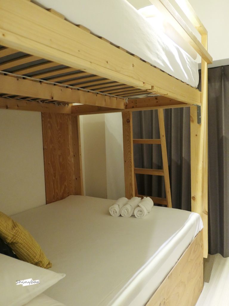 四人房是採上下鋪,上舖是單人,下鋪是偏小的雙人床,一旁還有可展開的沙發床