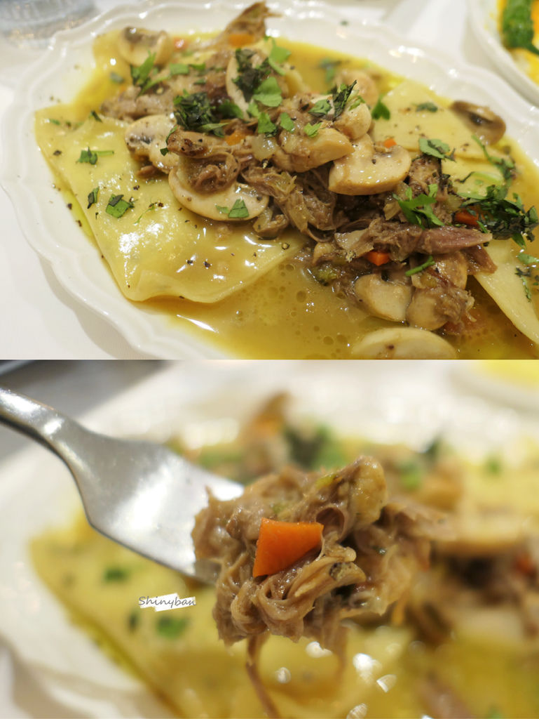 義大利餃子內,是清香的薄荷起司內餡,再淋上以鴨肉及蘑菇做成的奶油醬汁,濃郁帶有肉。鴨腿口感細緻扎實,蘑菇鮮脆,餃子滑順,非常得我喜愛。