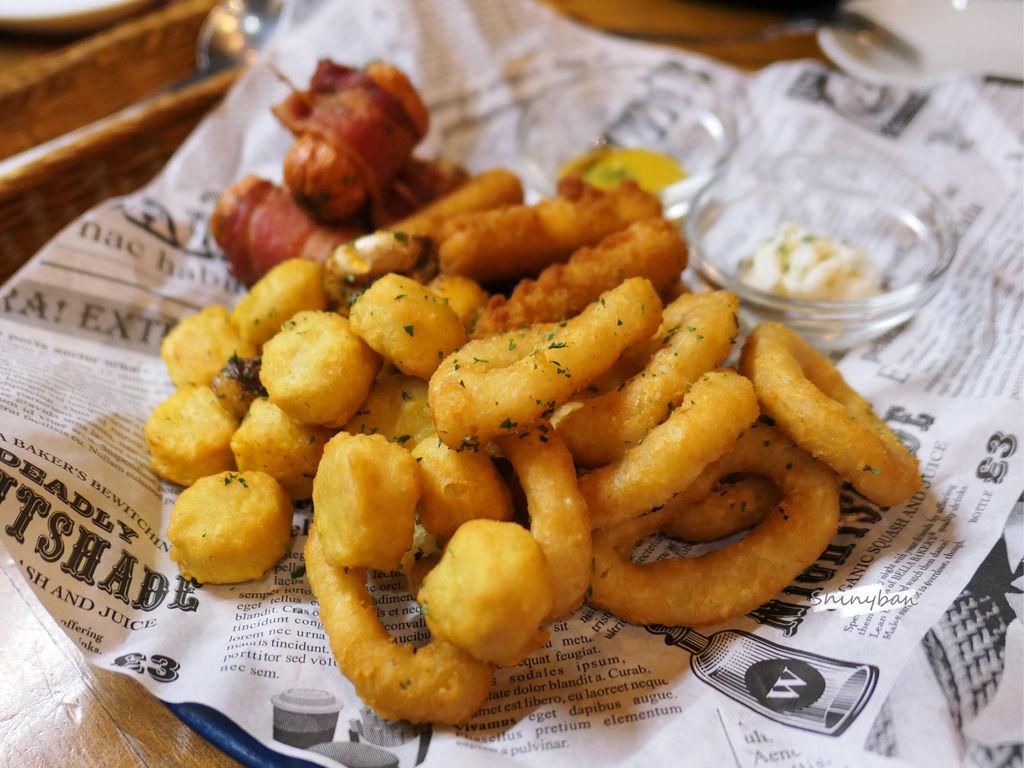 炸物拼盤是聚會搭酒的好夥伴,拼盤裡有雞米花,薯條、小熱狗等等,口味可想而知就不多贅述。