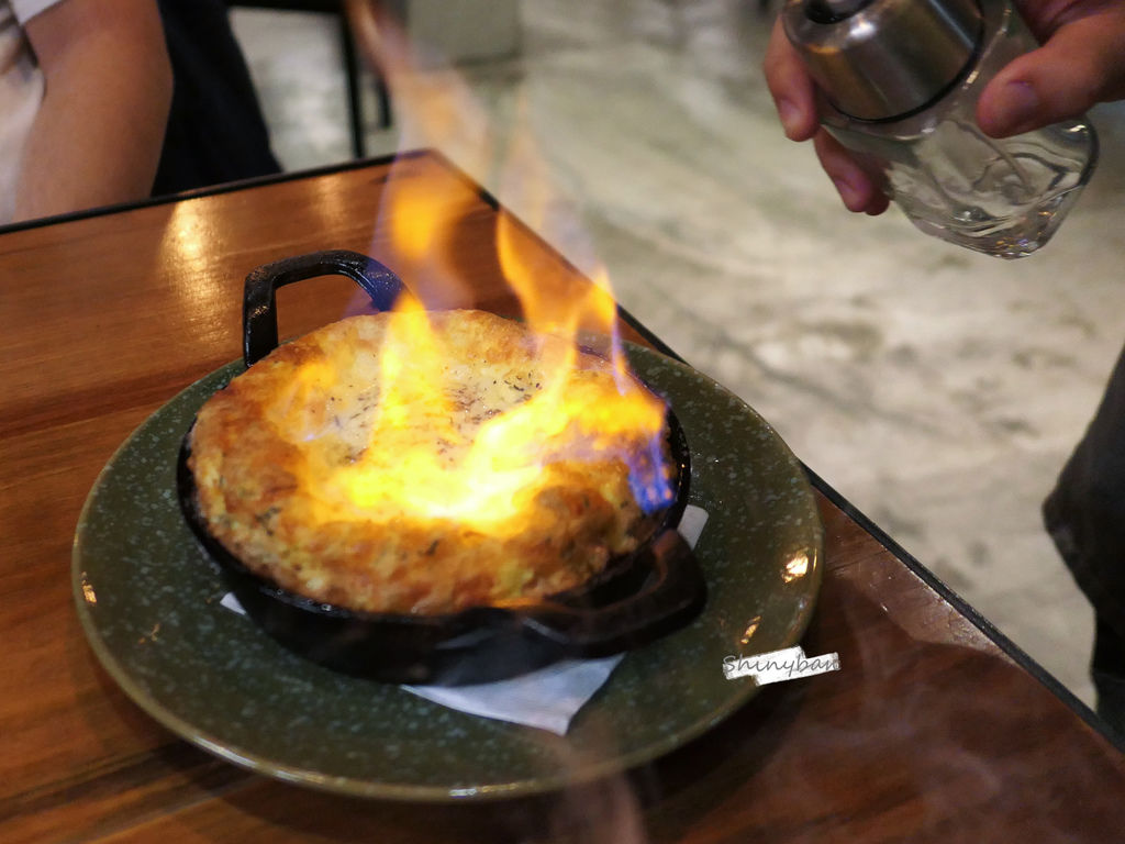 親自在眼前烘烤的起司烘蛋,厚實軟綿,內餡有著豐沛牽絲的起司,濃郁美味。