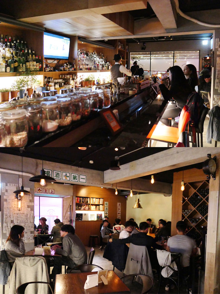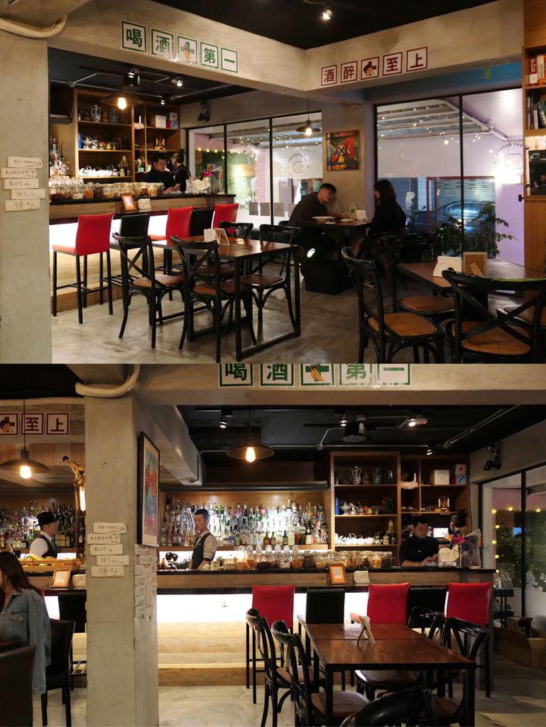 水泥牆、木桌椅、昏黃吊燈、隨意的擺飾,呈現出輕鬆自然不拘束的氛圍,適合多人朋友聚會。而在十一點過後,店家會把燈光調暗,頗有情調。
