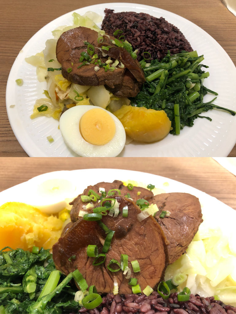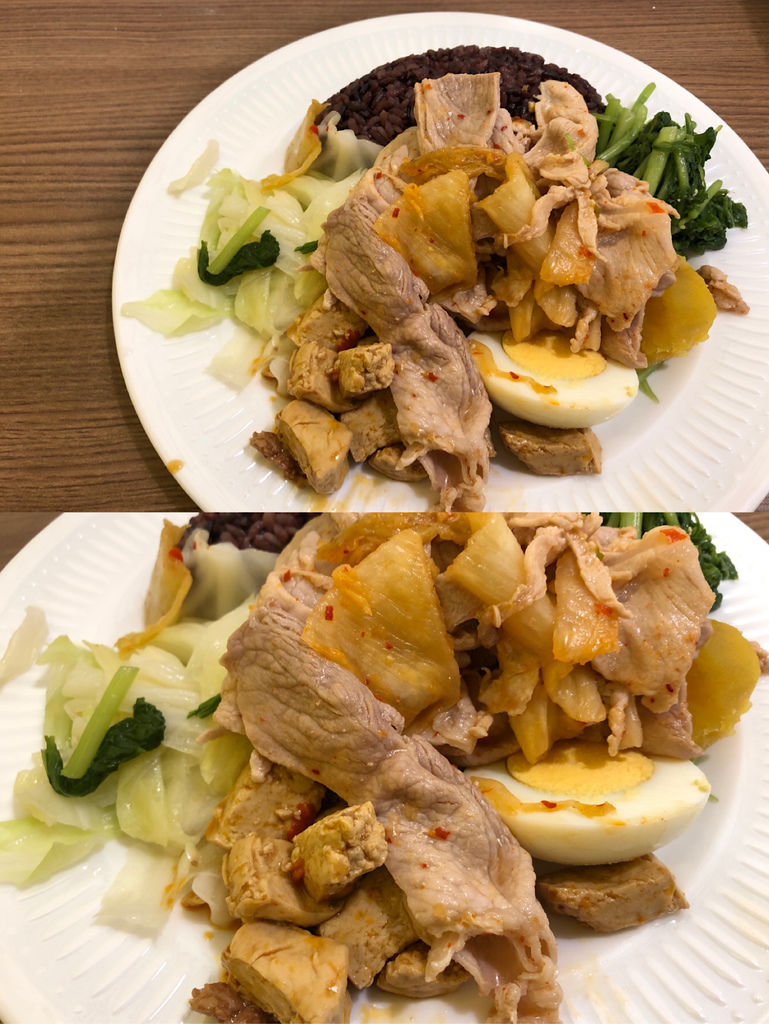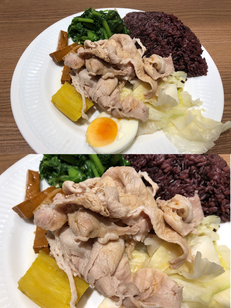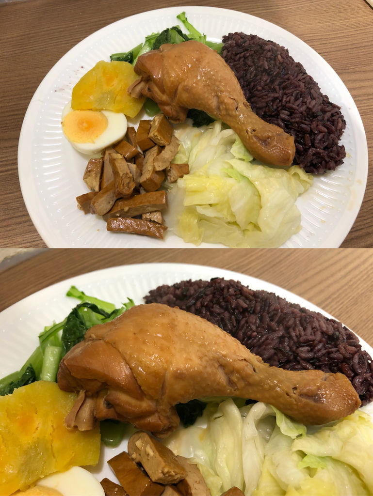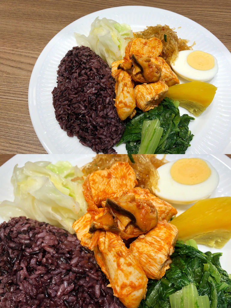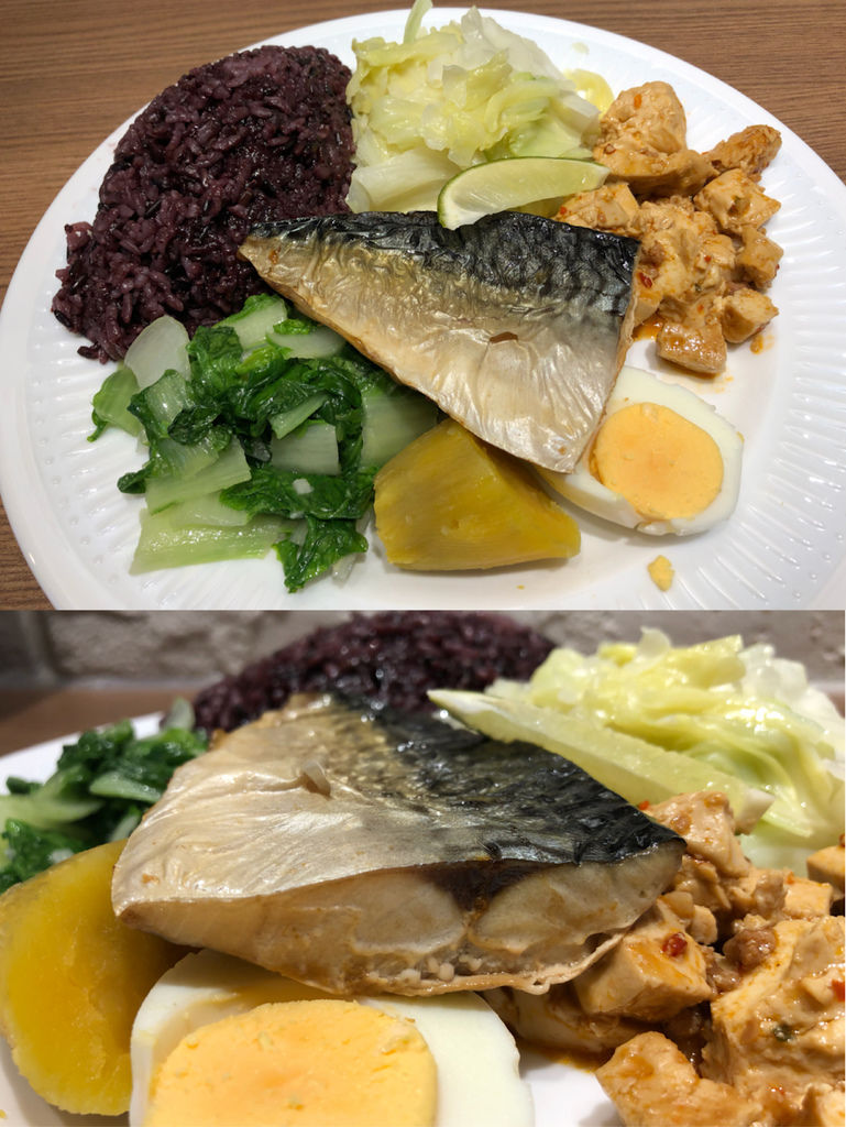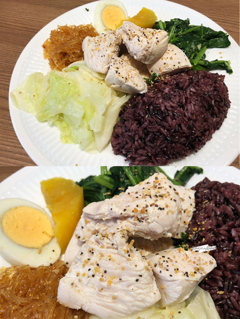便當的內容物除了紫米飯跟主菜之外,還有半顆蛋、一塊番薯以及三樣配菜,以健康餐盒來說,算是豐盛以及大份量。