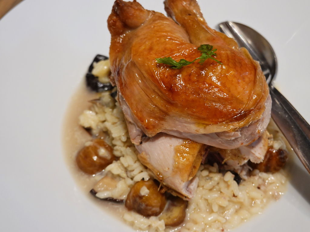 奢華使用半雞的燉飯,剛上桌時會是完整呈現,待饕客拍完照後才會拿到一旁去骨。這烤至金黃的雞皮光用看的就令人垂涎欲滴,而不用我多說,這道即是主廚以桶仔雞為發想,混合義式燉飯元素製成的中西合併餐點。