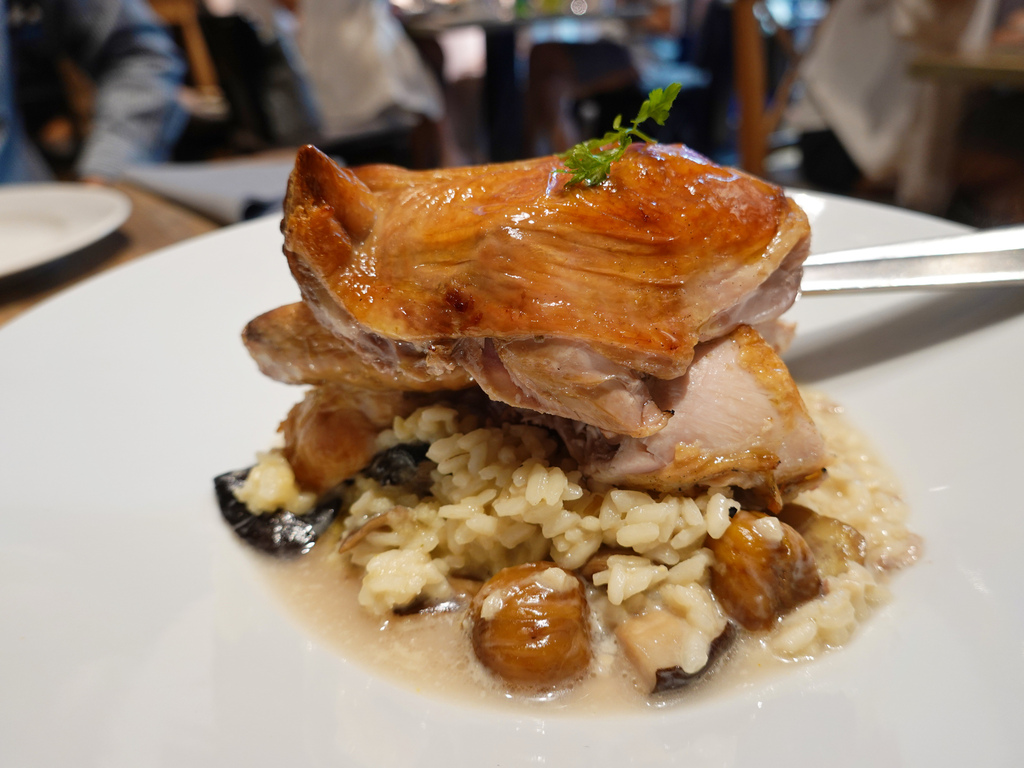 除了桶仔雞本身,其配料跟燉飯也是滿分的表現。燉飯帶有正統的米芯感,雞汁滲入米飯中更添滑順與香氣;栗子鬆軟口感與香甜氣味更是令人著迷,只能說這道我真是愛慘了。