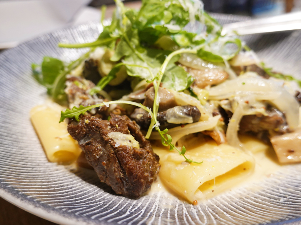 配料還有脆口帶鮮味的菌菇、微辛辣微苦的芝麻葉,而慢燉牛頰肉則是麵條與醬汁的另一主角,但老實說相比之下我有些失望,牛頰肉的口感不一,有些軟嫩帶膠質,有些纖維偏多偏乾硬,如果能一致些,相信完整度會更高。