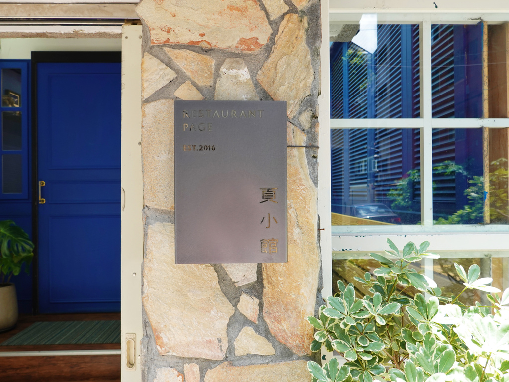 「Restaurant Page 頁小館」外觀頗為低調,與大直呈現的靜謐氛圍相互映襯,門口的銀灰色招牌上,鏤著店名與創始年份,很有質感。