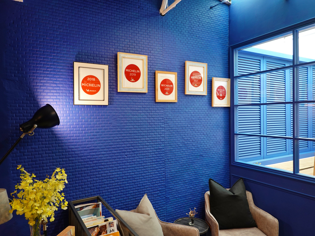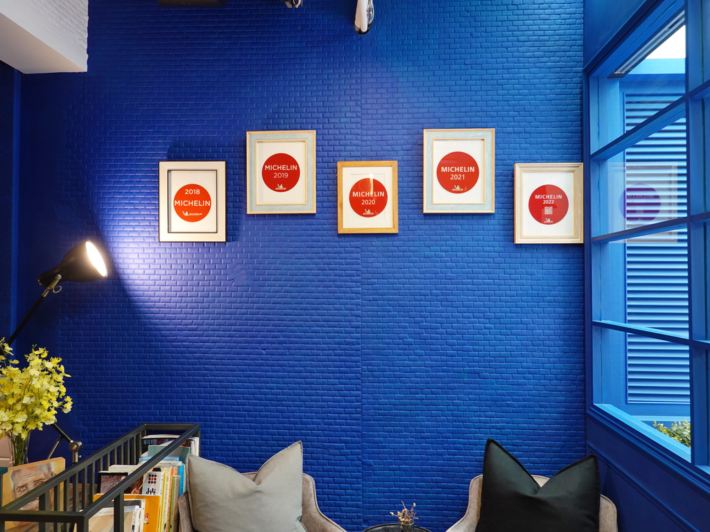 一進門,妝點寶藍牆面的就是耀眼的米其林獎章,自2018年起已連續榮獲米其林指南殊榮,其觀點為擅長將亞洲元素揉和西式菜餚,的確名符其實。