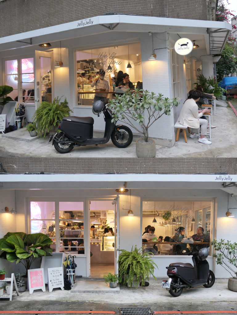 「JellyJelly 慢工烘焙」位於臨沂街的巷弄中,從忠孝新生站走來約五分鐘腳程。吸睛的潔白店面坐落於轉角,還有著大片的玻璃窗,外頭有著零星的露天座位,是許多客人喜愛的IG美照區。