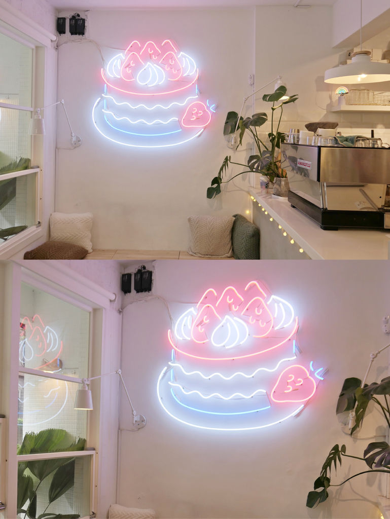 一進店內左手邊是可愛的蛋糕霓虹燈飾,不用我多說,就是個拍照的絕佳位置,但對我這只愛拍拍美食拍拍景色的人來說,就沒有太大的感受了。