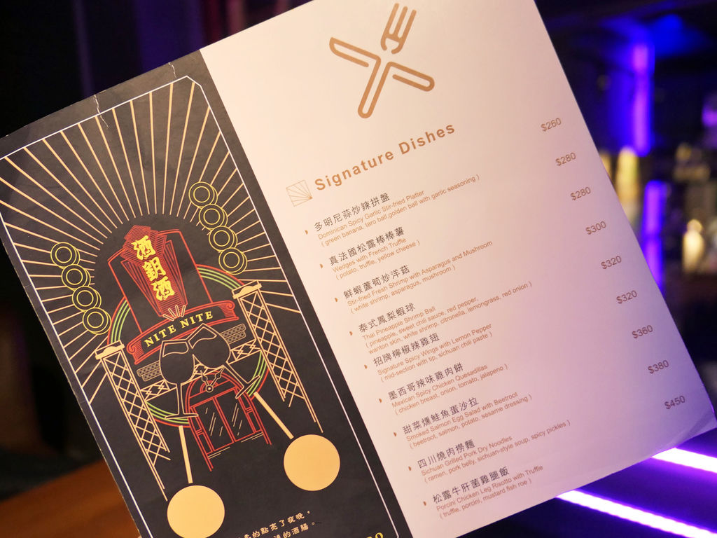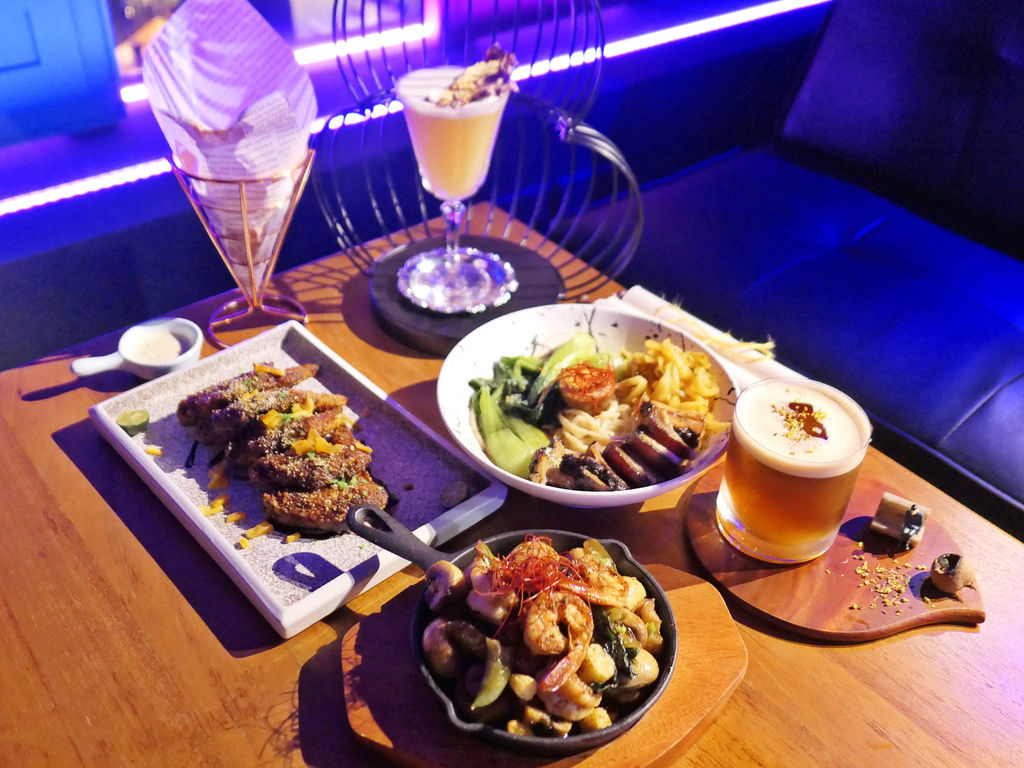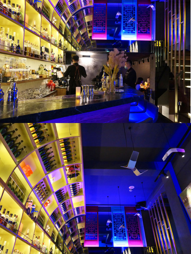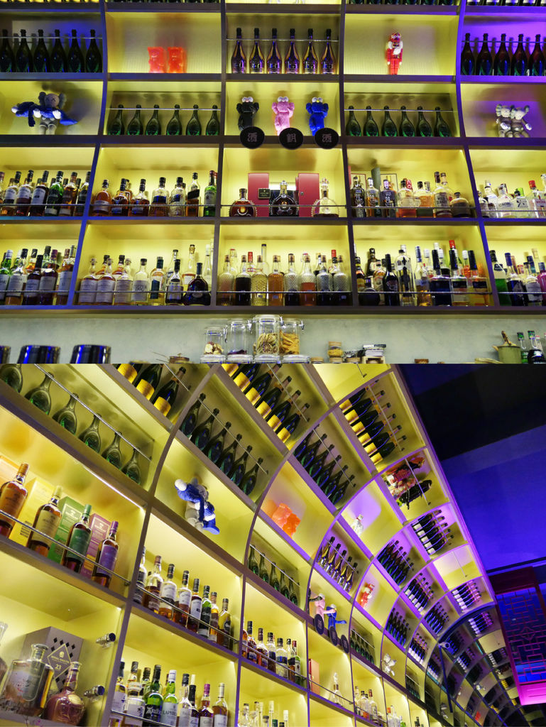 一進門最吸睛的,莫過於吧檯旁這整面高達兩層樓的拱形酒架。有別於店內藍紫霓虹色調,底色使用亮眼的黃色,上頭放滿各式酒款,而猛然一看,竟然還穿插了一些老闆自身的潮流收藏,增添新意。