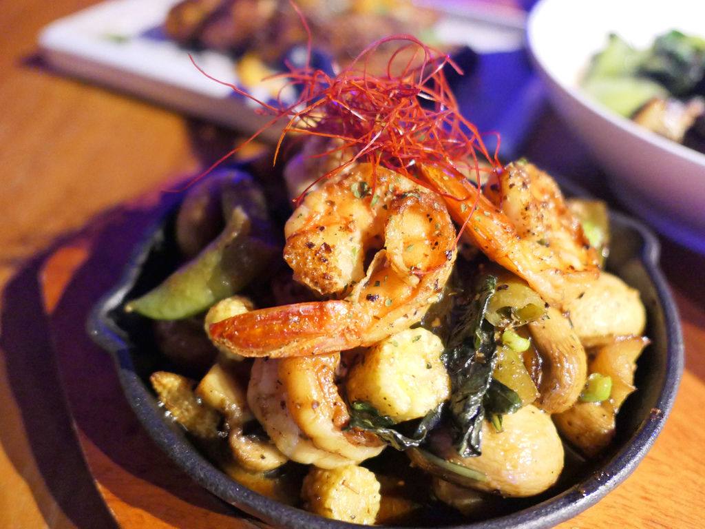 蘑菇鮮脆、鮮蝦Q彈,裡頭還有玉米筍及碗豆夾,滿滿的胡椒香與九層塔等香料味,我一個人就可以吃掉一盤。