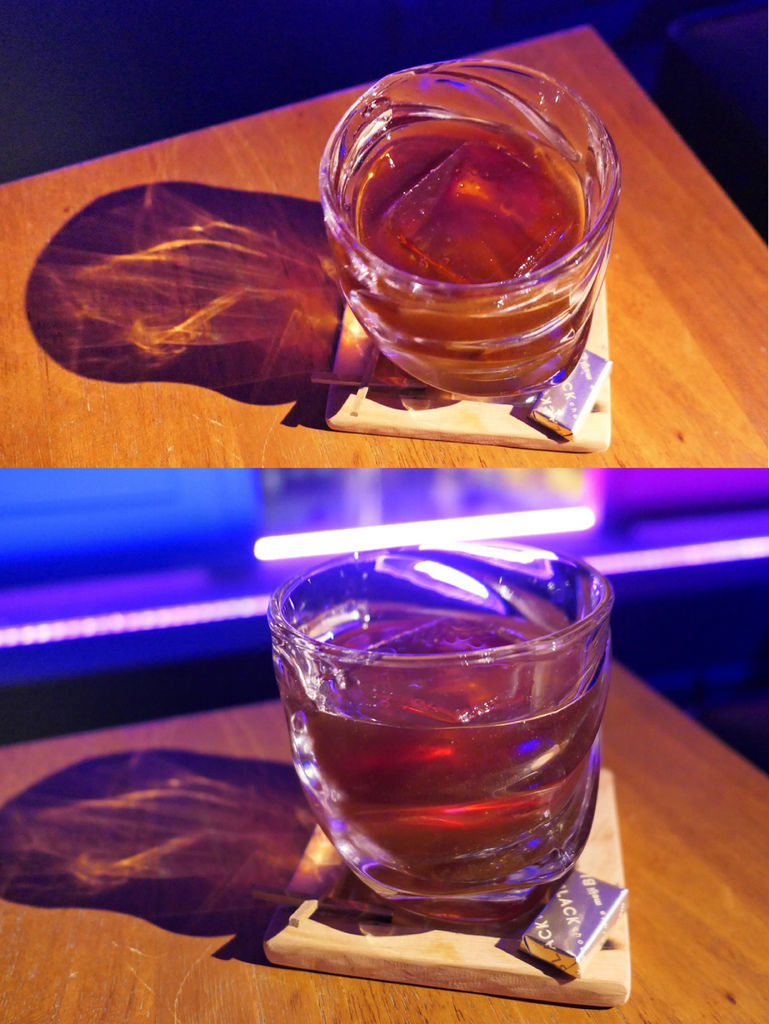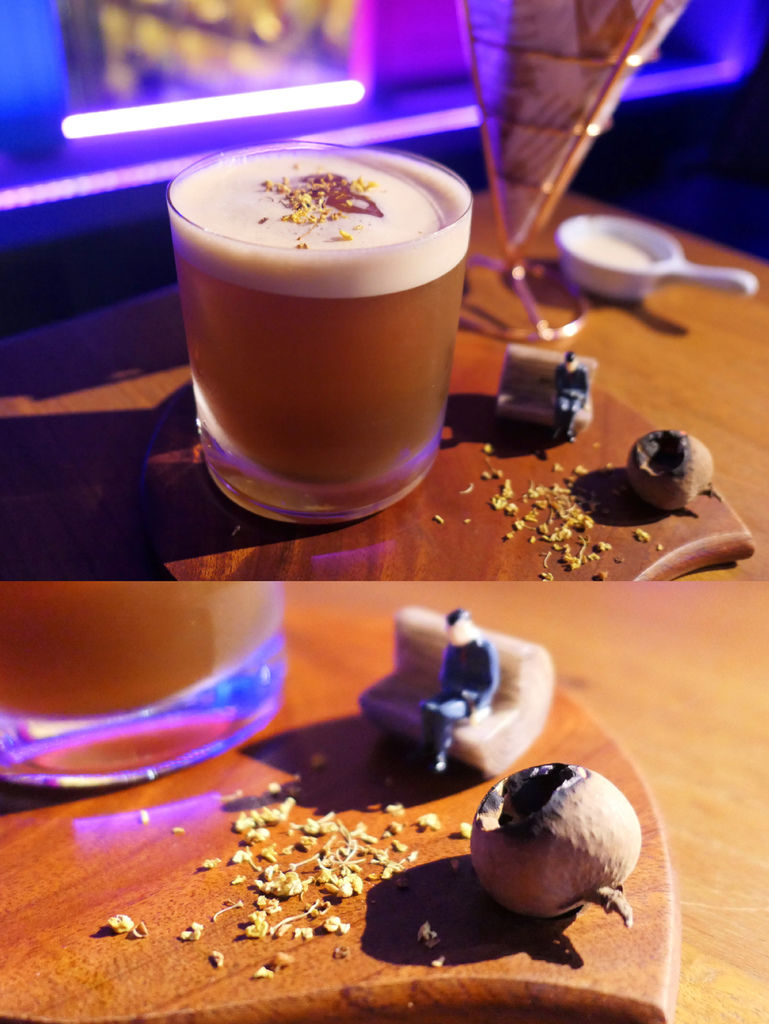 入口是烏梅汁的酸度,中段有煙燻泥煤味,後段則是淡淡johnnie walker 黑牌威士忌芳香貫穿,長長尾韻是桂花香氣結合木質煙燻,是款溫和且舒服的威士忌調酒,比一般威士忌調酒酒感來得低。