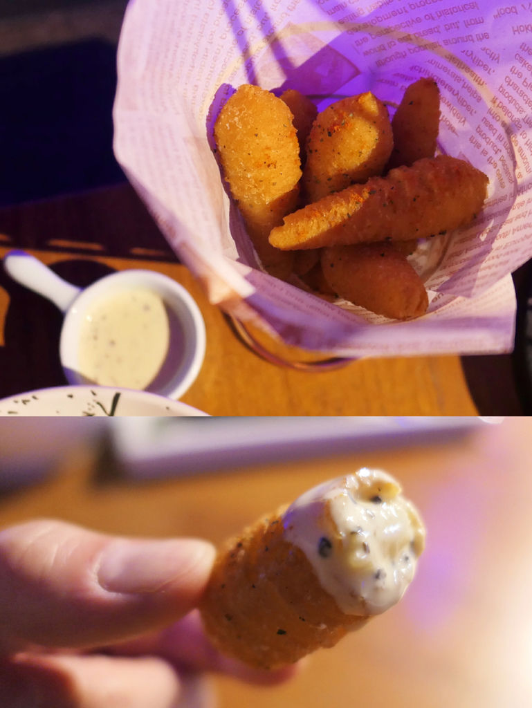 這裡的薯條不是單純的條狀薯條,而是使用薯泥做成偏胖的棒棒薯形狀,形成外酥內綿密,口感更為優異。沾取松露醬香氣十足,會讓人不知不覺一口接一口掃空。