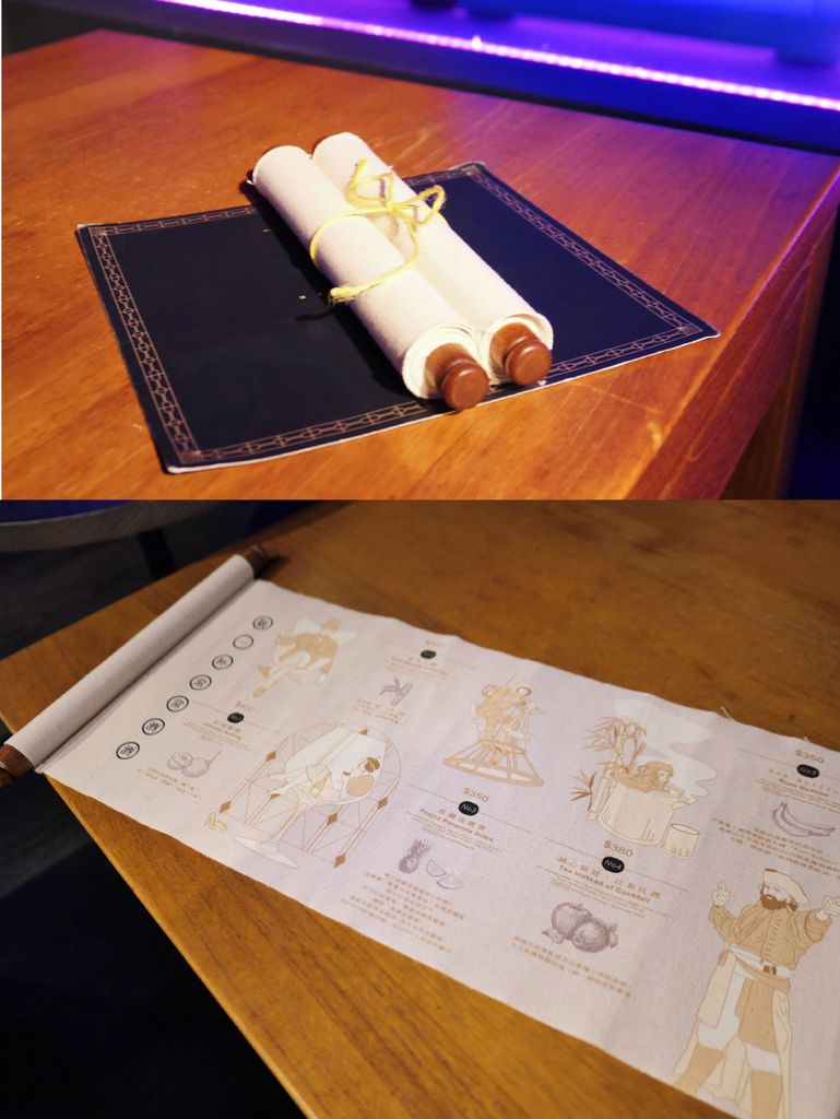 「酒鈅酒」的酒單設計成卷軸的樣式,一展開是店內八款特色調酒的圖示介紹。雖選擇不多,但每一款都是老闆使用在地元素及食材,運用低溫舒肥手法打造出的特色調酒,在其他餐酒館難以尋得。