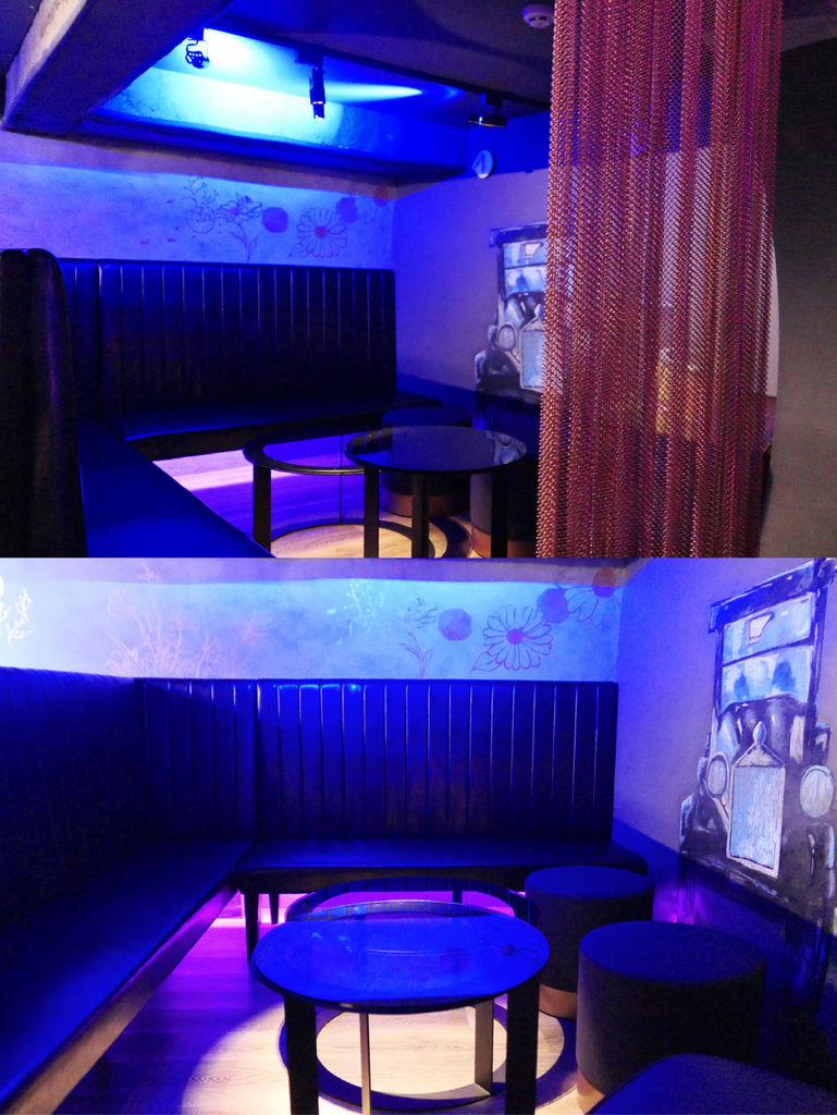 「酒鈅酒」有兩層樓,一層樓主要是吧台及少數的桌型座位區,二樓則是燈光較暗,較具隱密性的包廂空間。