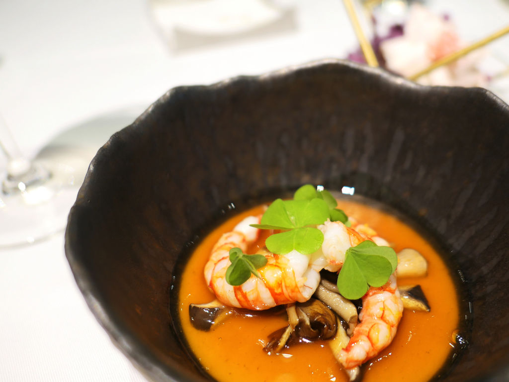這道季節創作有點東西合併,底層是柔嫩的蒸蛋,淋上柴魚高湯後,擺上胭脂蝦及美人菇,有懷石料理的精緻感。