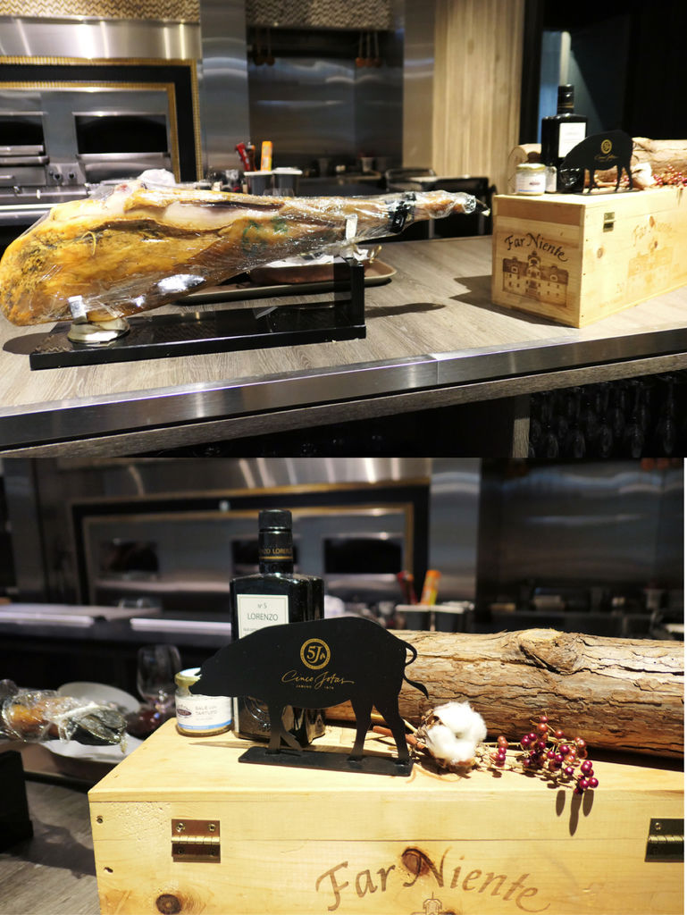 而在料理檯前,還展示了5J的伊比利火腿,在西班牙有火腿之王的美稱,不要看他區區一隻火腿,售價竟近逼十萬元!